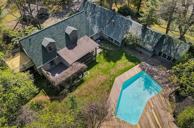 The home is a group of mid-19th century log cabins that were moved to the site and reconstructed into a single residence around 1930: “The den and sunrooms were added later & the primary suite/bonus rm added in 1994.” The property includes a gunite pool, pool house, barn and detached garage.