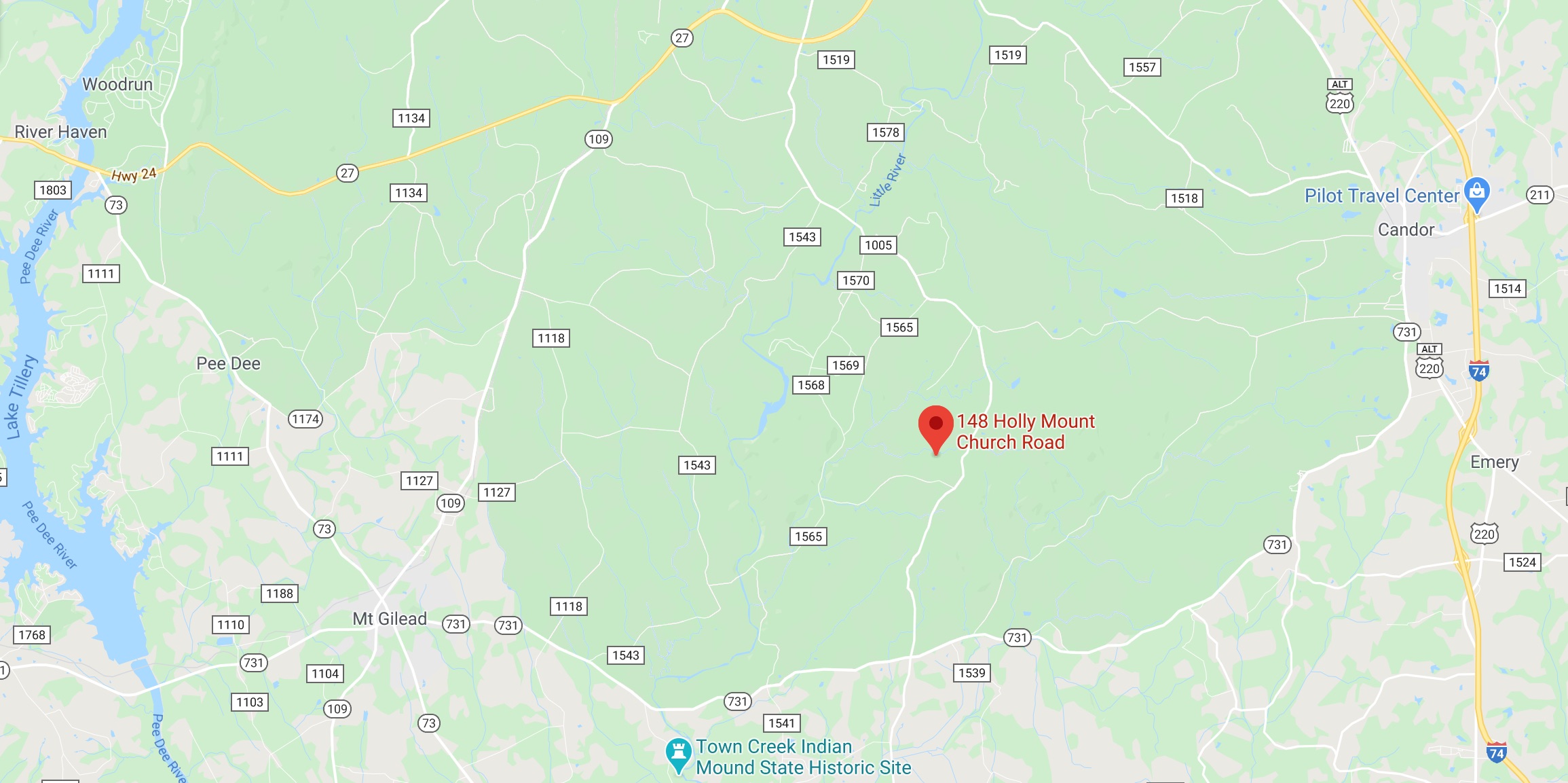 148 Holly Mount Church Road is in the Uwharrie National Forest, maybe halfway between Candor and Mount Gilead. It sits well off the road. Its gravel driveway runs through some number of other properties before it gets you home.