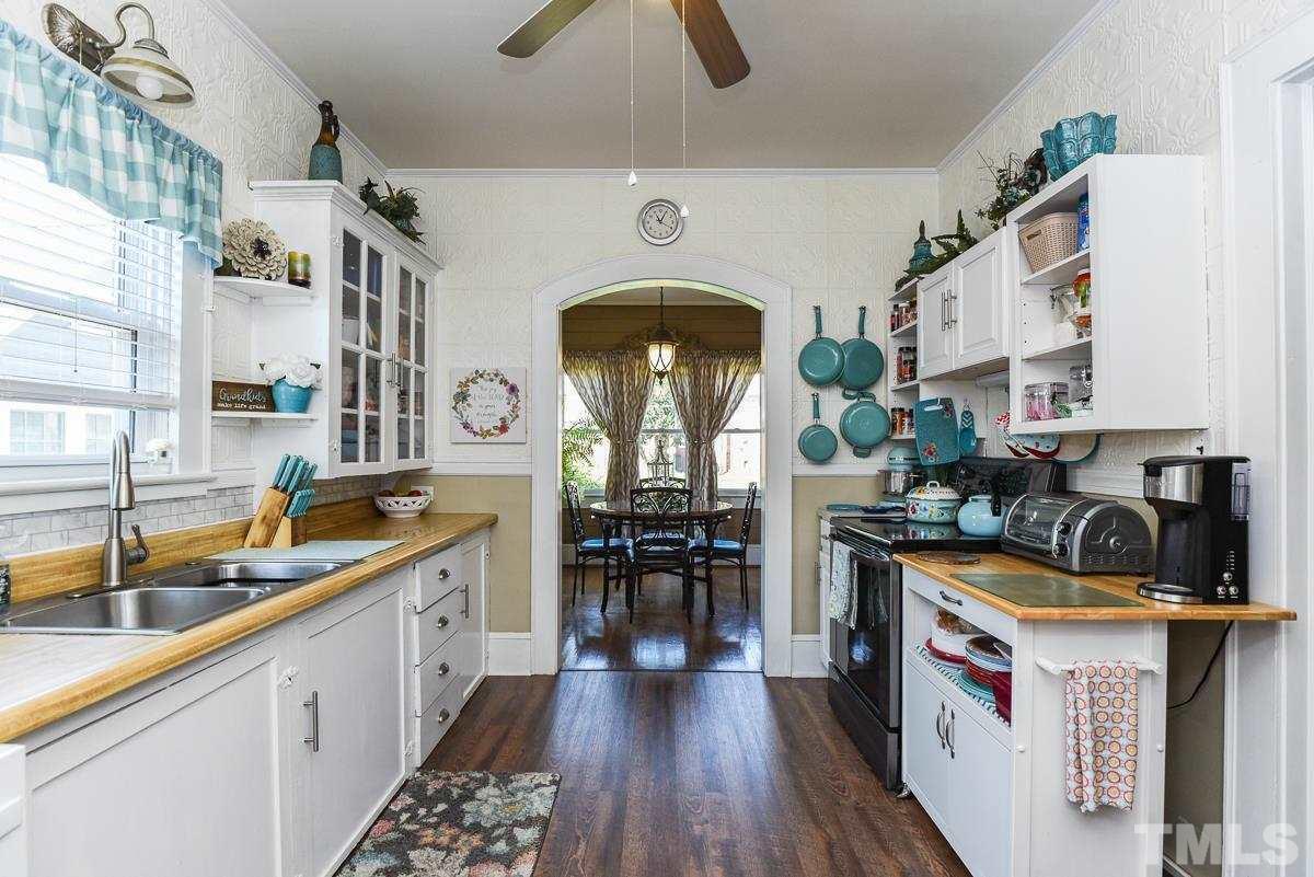 The house is in Graham’s North Main Street Historic District. The French Normandy Revival-style home features “a steeply pitched hip roof, a round witches cap entrance turret, segmental arched door openings, glazed and paneled doors, and decorative eave brackets,” the district’s National Register nomination says.
