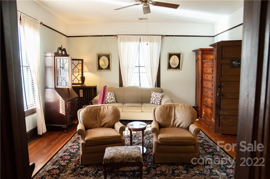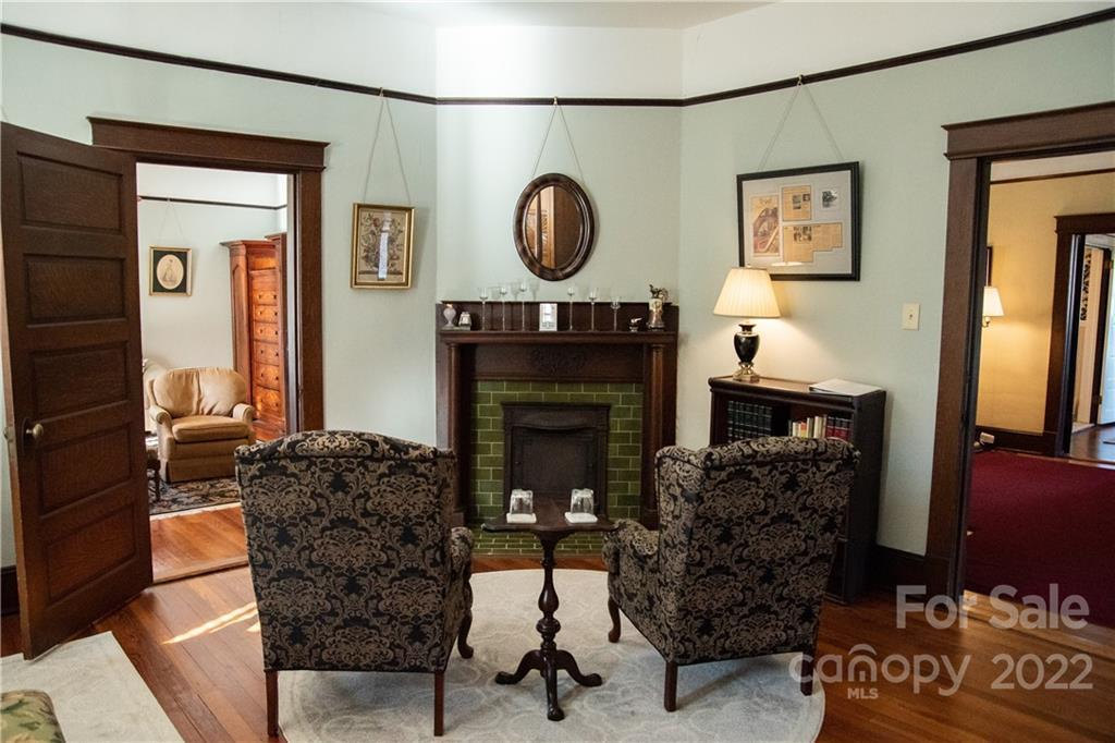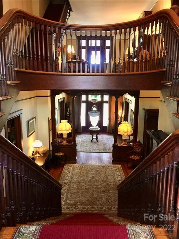 “Designed by Greensboro architect G. Will Armfield, the house features a bowed, two-story, Ionic portico and an exceptionally generous center hall with a grand split-run stair. The house’s interior trim – including a handsome first-floor portal and eight mantels – remains completely intact. …