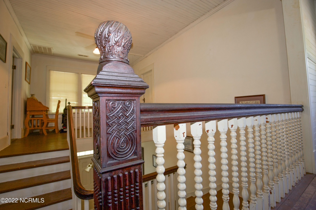 “Oscar inherited the plantation house with 180 acres in 1888. He made renovations to the house, which included a crystal chandelier from Europe, a hand-painted landscape mural, and the installation of carved doors which were a gift from one of the Rockefellers (a member of his church). He installed an art glass window (said to be commissioned by Tiffany Studios in NYC) in the library of the plantation house bearing the initials O.H.”