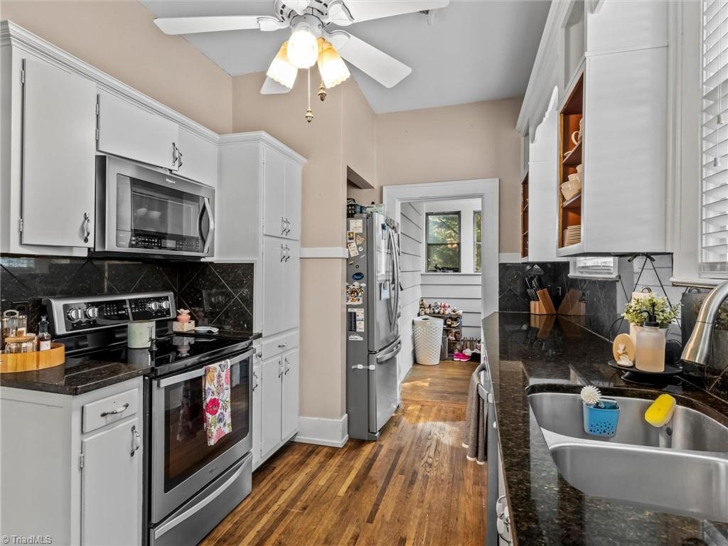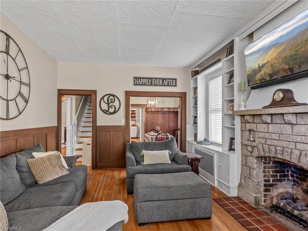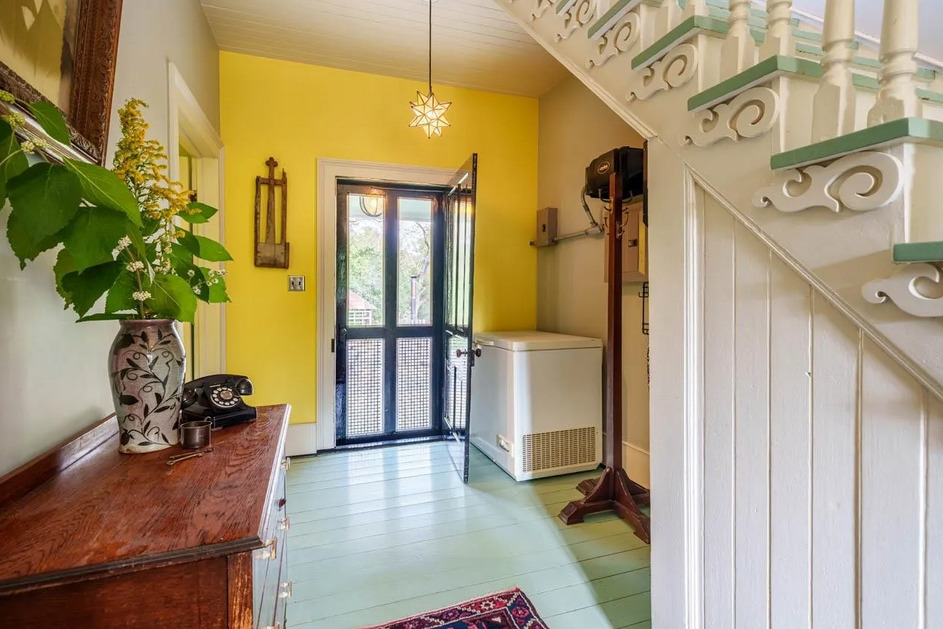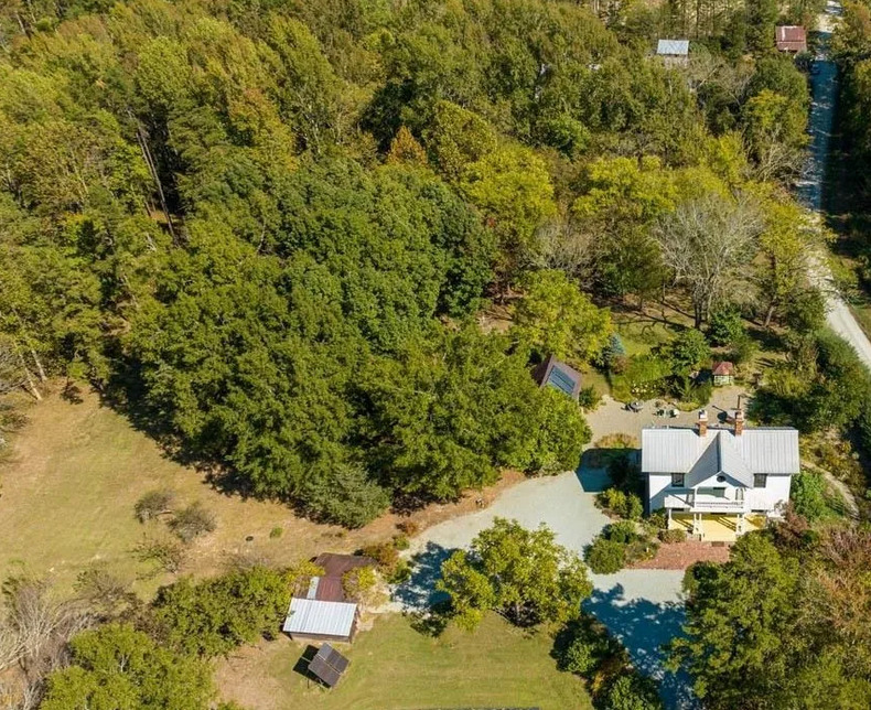 The property has been designated an Orange County Landmark. The original 1850s kitchen was converted to covered outdoor dining. The property includes a wood-stove-heated hot tub, solar powered koi pond, a large equipment/party shed, a guest suite that was originally a tobacco barn, an artist studio with a kitchen and bathroom, and a workshop. There’s a Rumford fireplace in there somewhere.