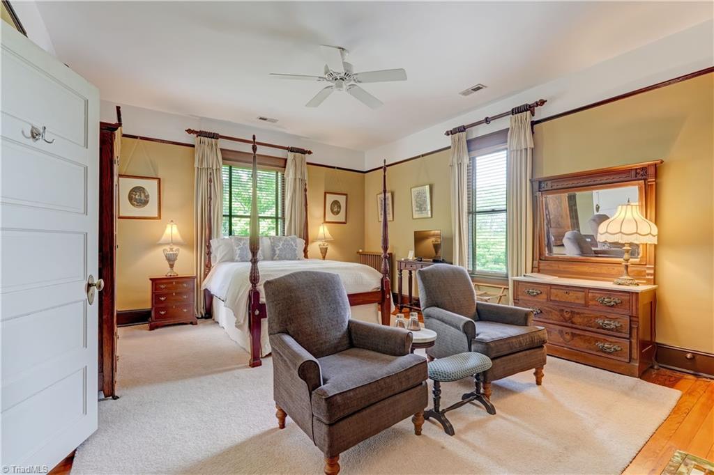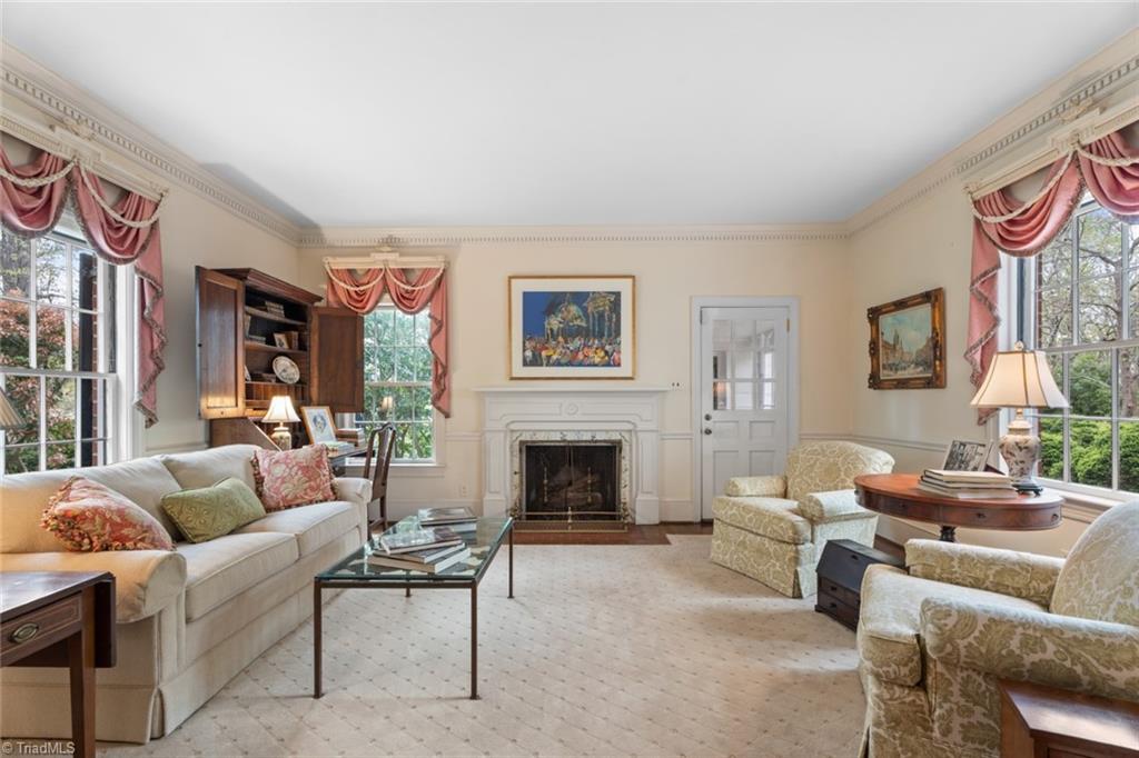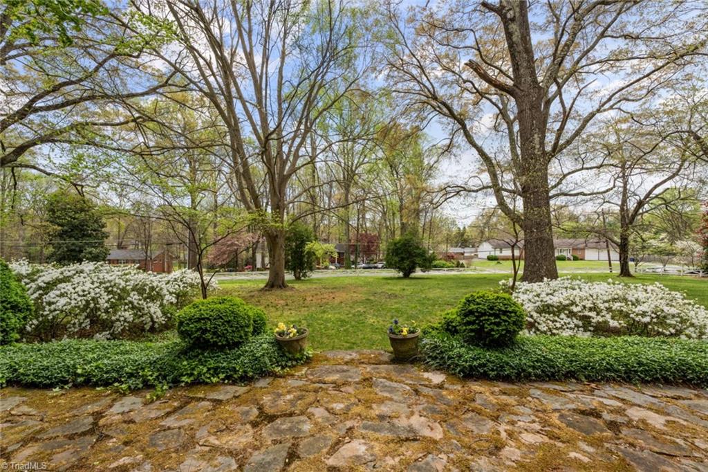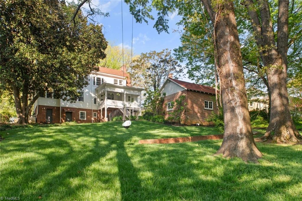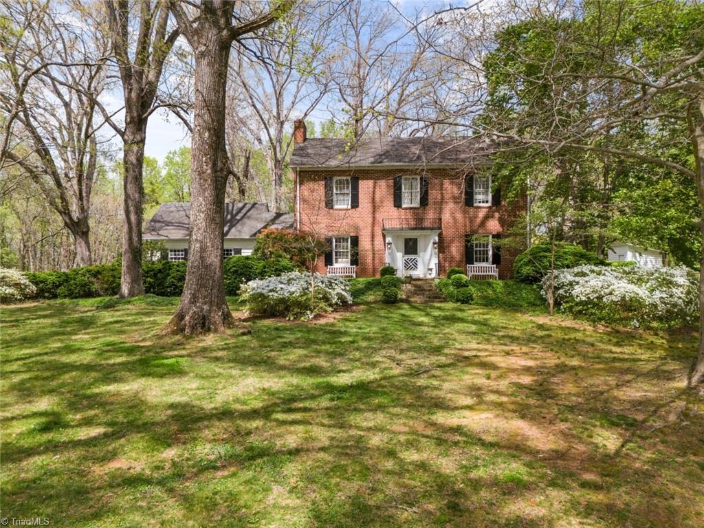 The Colonial Revival house overlooks Lake Brandt. The property includes a 1/6 ownership of the private, 26-acre Richardson Lake. The driveway runs a half-mile from Lake Brandt Road, across the Richardson Lake dam to the house. On a square-foot basis, the house is far less expensive than many less remarkable properties for sale in Irving Park, Sunset Hills and other Greensboro neighborhoods.