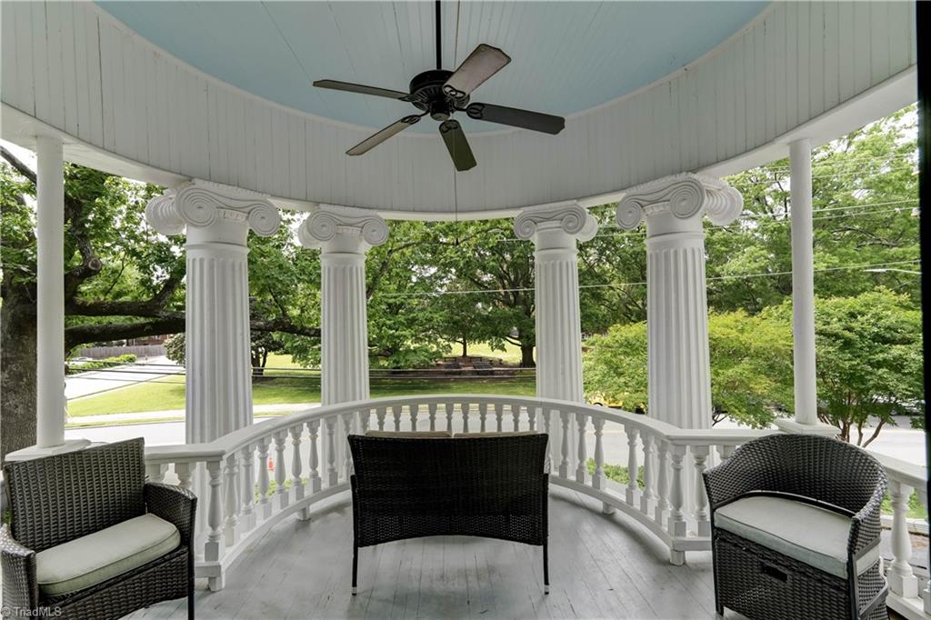 The house has been for sale, on and off, for two years. It was relisted again on April 18. Listing: “This is a turnkey business sale with all furnishings, fixtures and equipment included.” NRHP nomination: “The dominant exterior feature of the Martin residence is the broad front porch with Tuscan columns and a turned balustrade which carries across the full facade and the forward bays of each side elevation. The centerpiece of the porch — and of the entire house — is the bowed, two-story portico supported by four fluted Ionic columns with large terra cotta capitals. The portico shelters a bowed, second story balcony with a turned balustrade.”