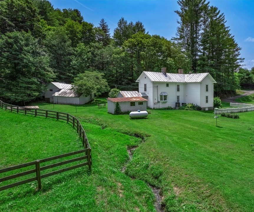 - Listing: A creek runs through the property, which includes a fenced-in pasture, a historic springhouse/laundry room, garden shed, carriage house, woodshed, workshop, root cellar and barn.