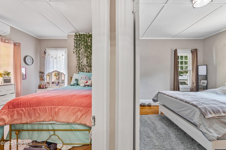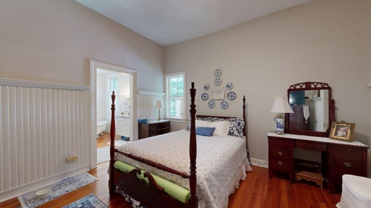 District NR nomination: “Pyramidal Cottage. One story; hip roof; pressed tin shingles; front-gable dormer; two-over-two, double-hung sash; engaged porch; chamfered posts; sawn brackets; spindle frieze; weatherboard.” The listing (and county records) show 3 bedrooms and 4 bathrooms in 1,056 square feet, which wouldn’t seem to leave much room for anything else.
