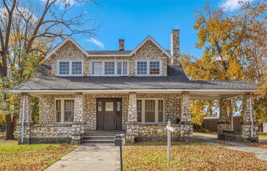 - District NRHP nomination: “large bungalow/craftsman house that is very distinctive due to its quartzite stone exterior; gable roof with wide front dormer that is gable front at each end with a shed in between; front porch with massive tapered stone piers extending to porte cochere. Approximately ],670 square feet.