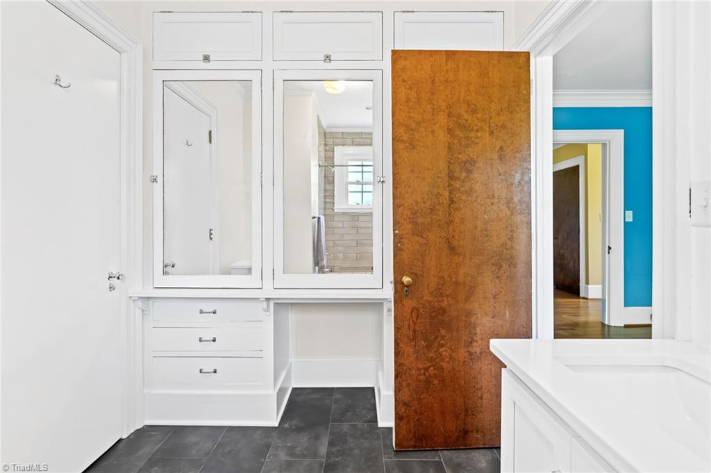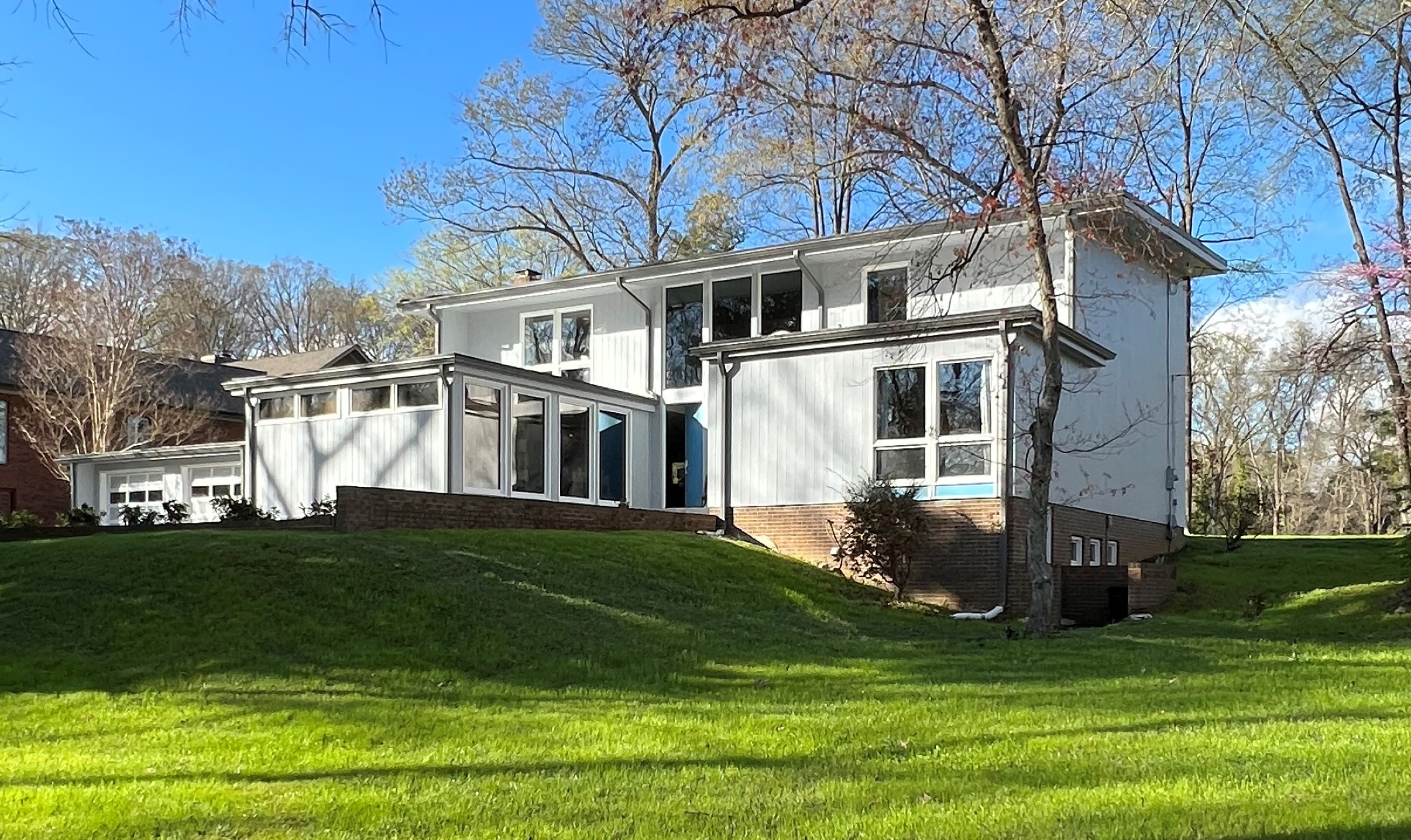 - The 11-bay, stucco Georgian mansion “features slightly projecting hip-roofed bays flanking the central section. A classical surround with fluted pilasters and an arched pediment frames the primary entrance. Three hipped dormers and brick interior chimneys with tall corbelled stacks pierce the Ludowici-Celadon green tile roof above a modillion cornice.” (Winston-Salem’s Architectural Heritage)