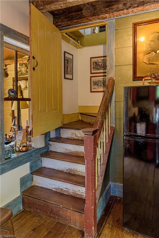 - “The floor plan is irregular, with two rooms, front to back, on the first floor, an enclosed staircase in a rear corner, and several rooms upstairs.