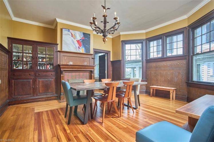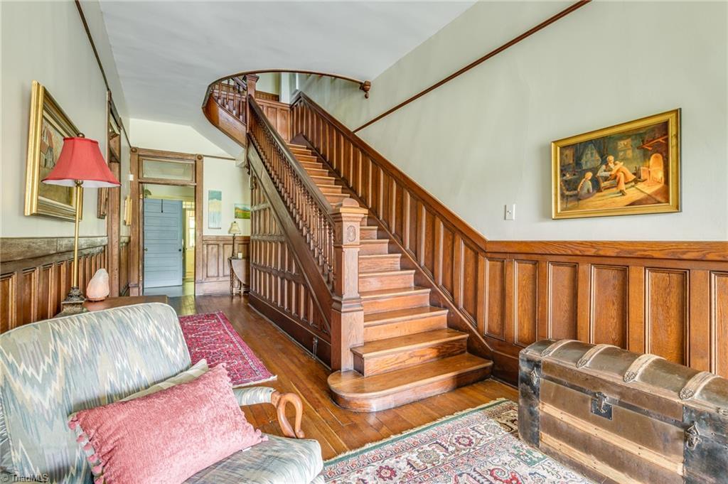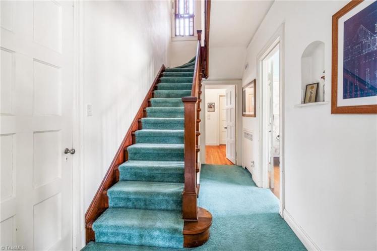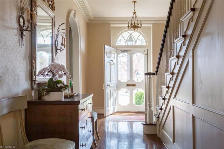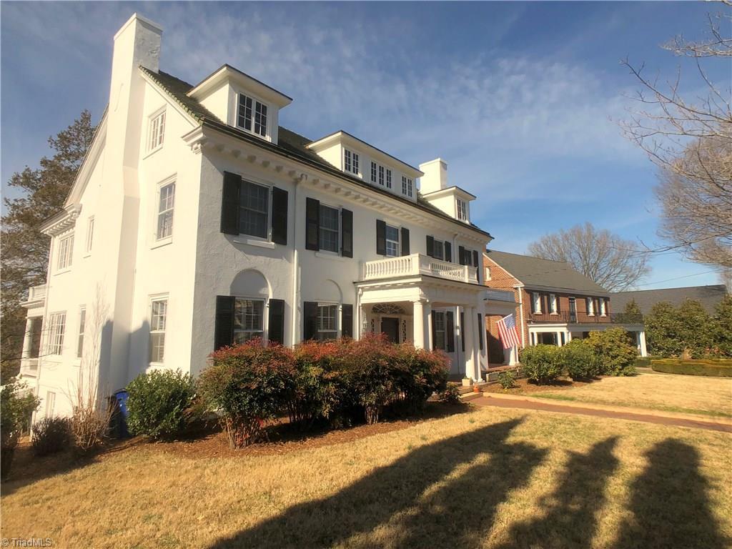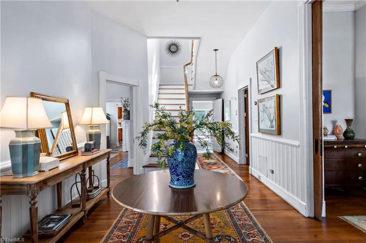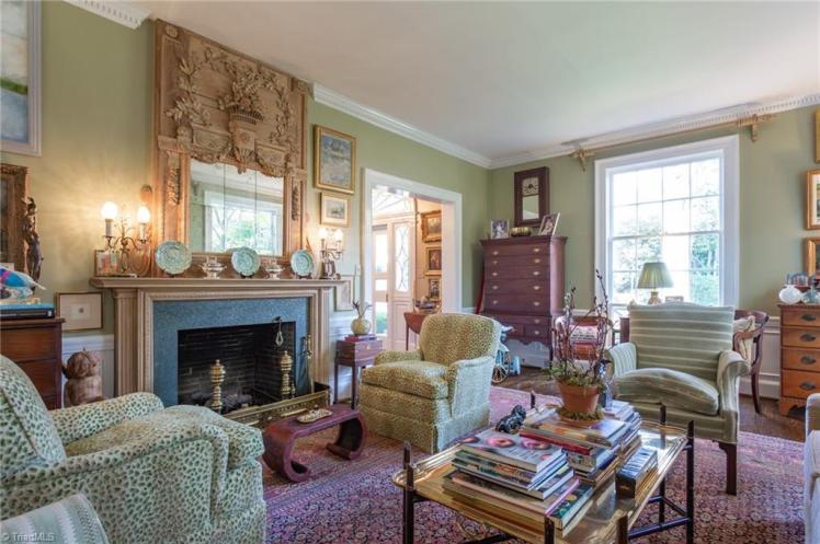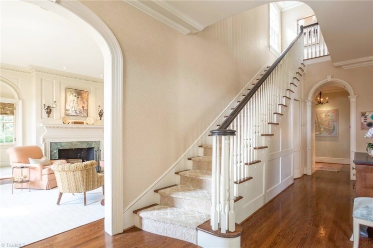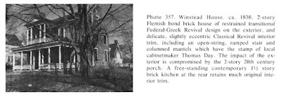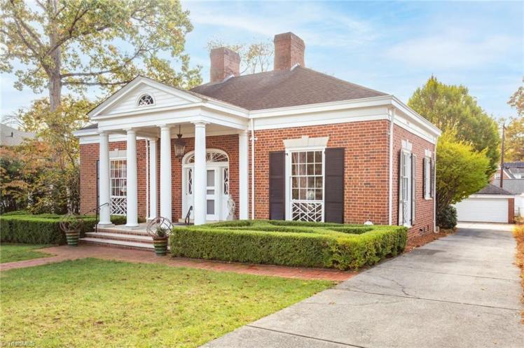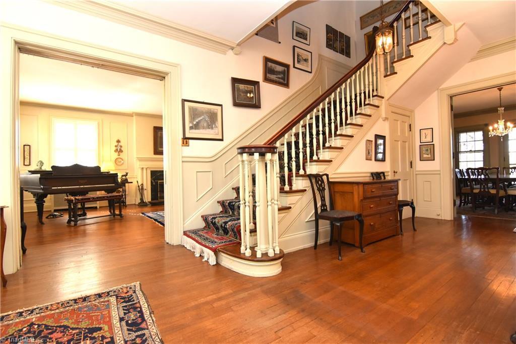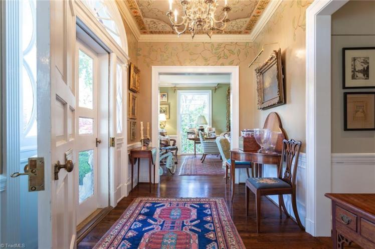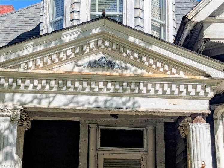 - “Exterior decorative features include splayed window and door surrounds, bracketed shelf entablatures, and leaded transoms and sidelights Porch and roof cornices are bracketed with paneled friezes. In the early 1960s the interior of the house was extensively remodeled to the Georgian Revival Style with the assistance of Otto Zenke of Greensboro.”