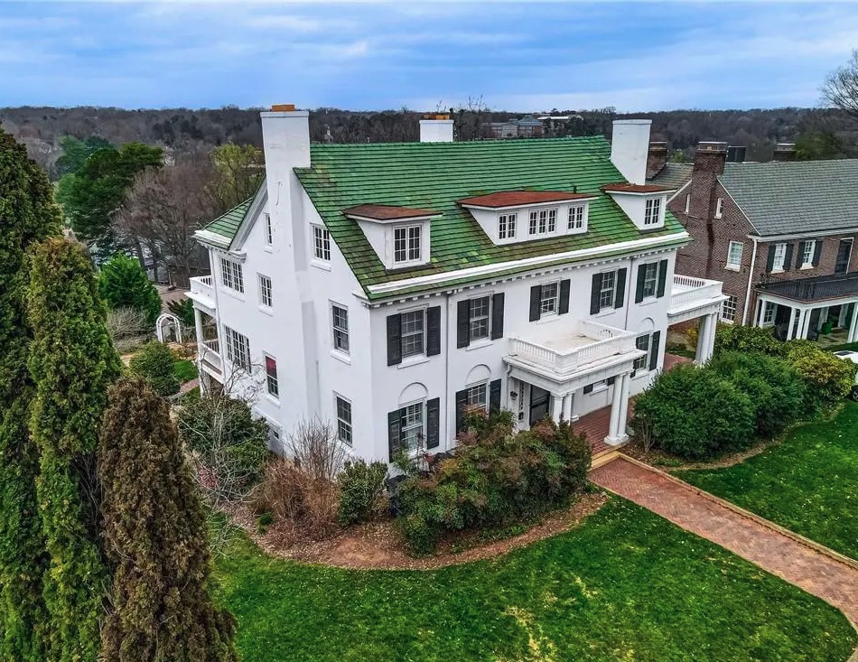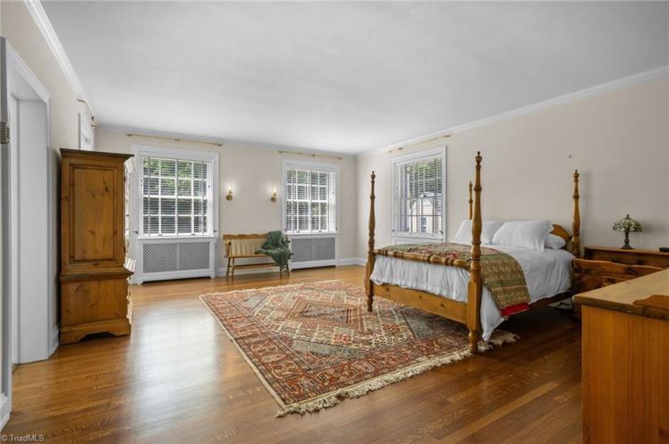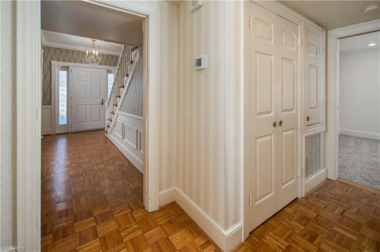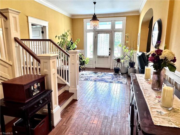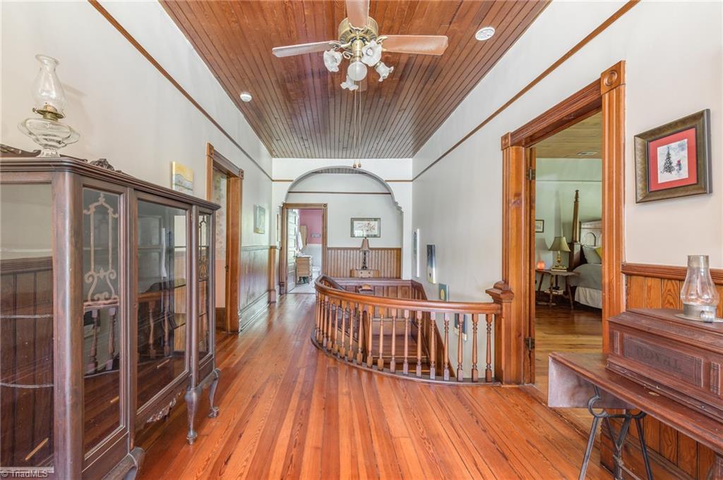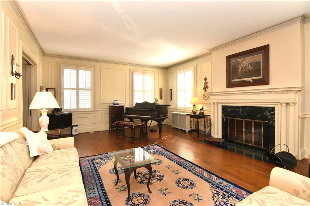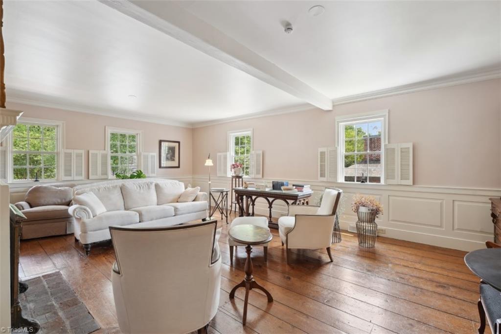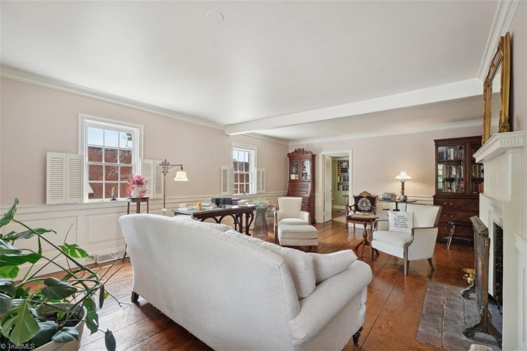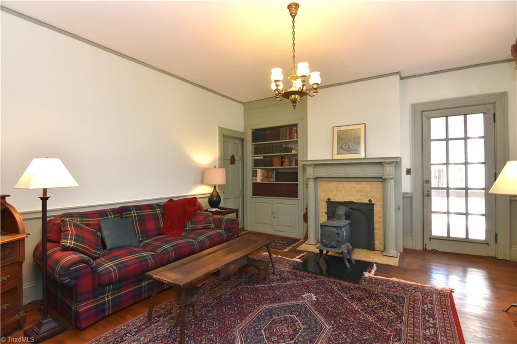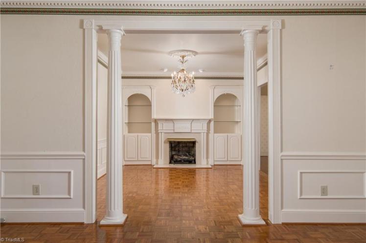 - “Exterior decorative features include splayed window and door surrounds, bracketed shelf entablatures, and leaded transoms and sidelights Porch and roof cornices are bracketed with paneled friezes. In the early 1960s the interior of the house was extensively remodeled to the Georgian Revival Style with the assistance of Otto Zenke of Greensboro.”