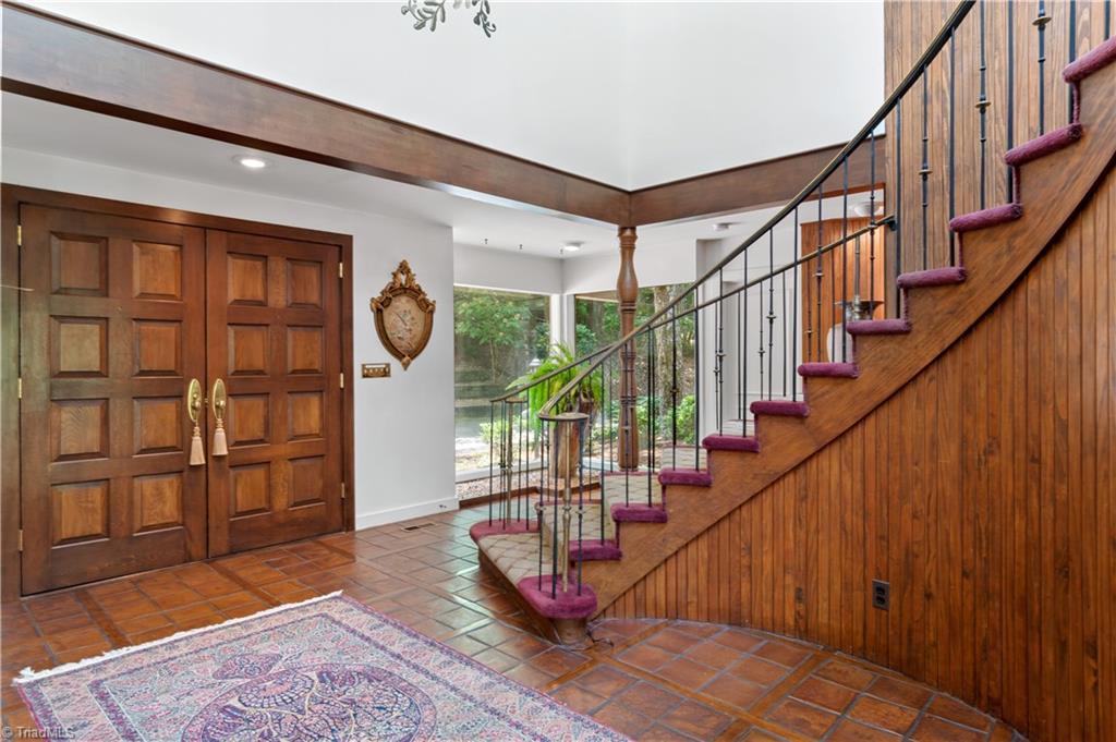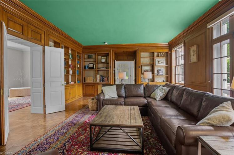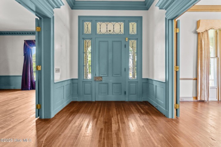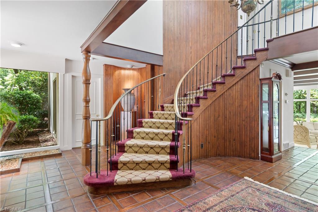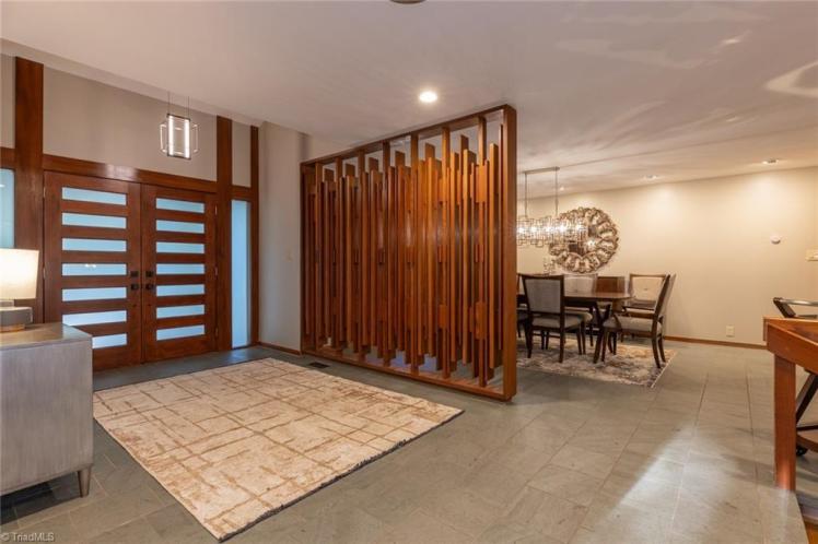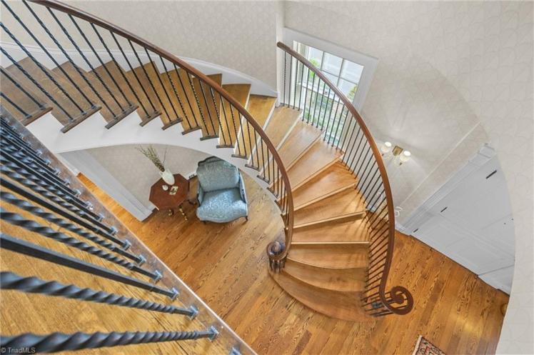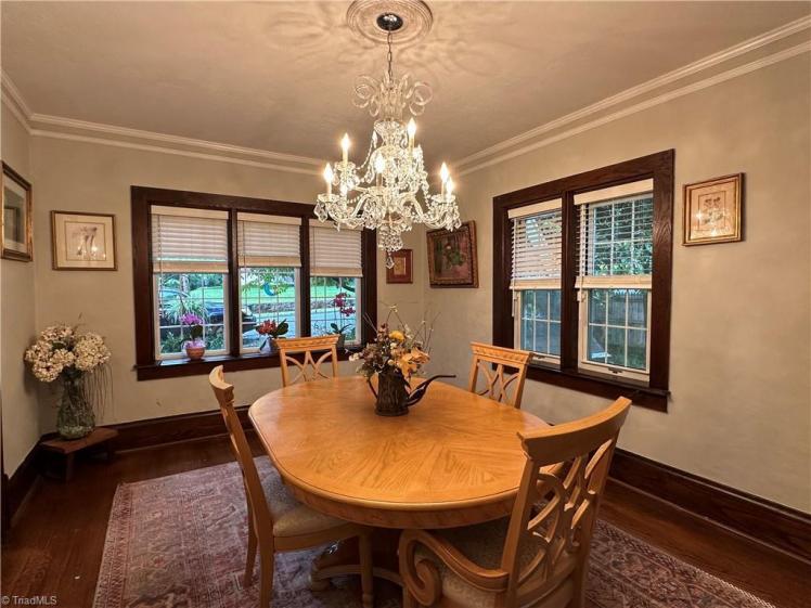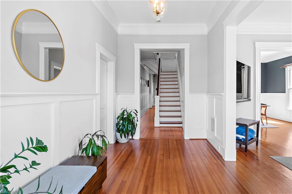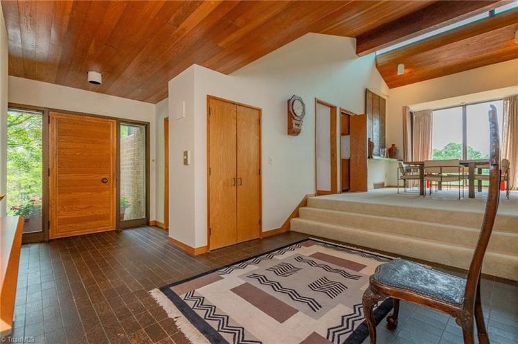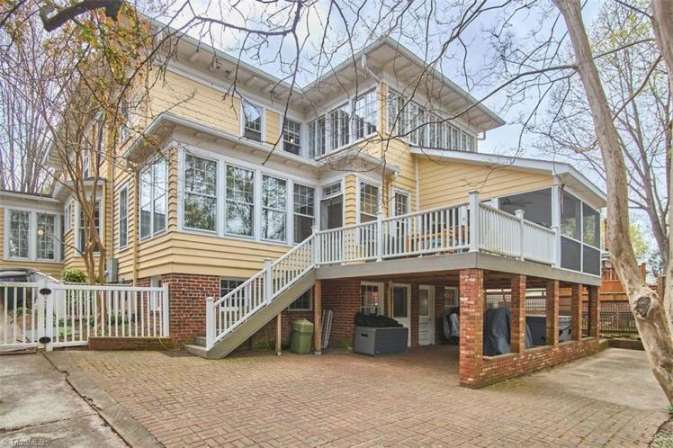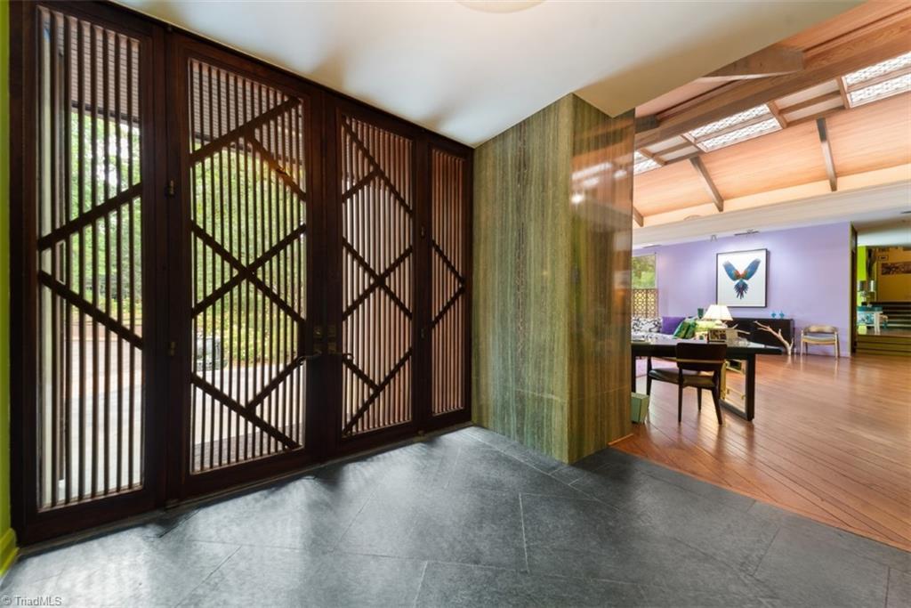 - “Exterior decorative features include splayed window and door surrounds, bracketed shelf entablatures, and leaded transoms and sidelights Porch and roof cornices are bracketed with paneled friezes. In the early 1960s the interior of the house was extensively remodeled to the Georgian Revival Style with the assistance of Otto Zenke of Greensboro.”