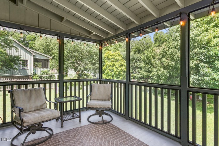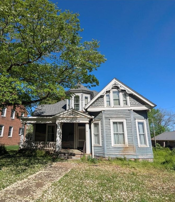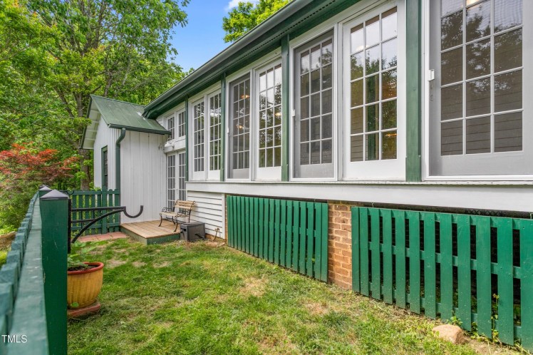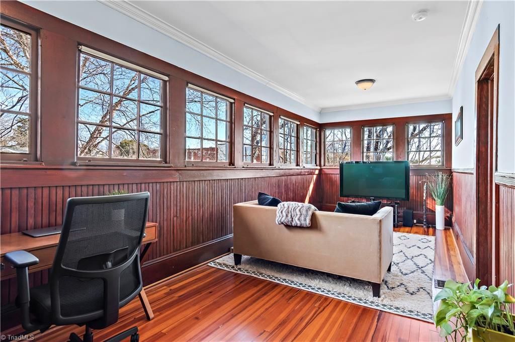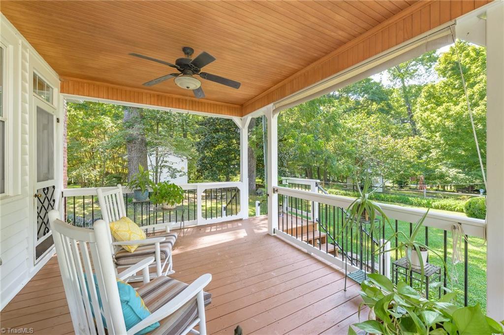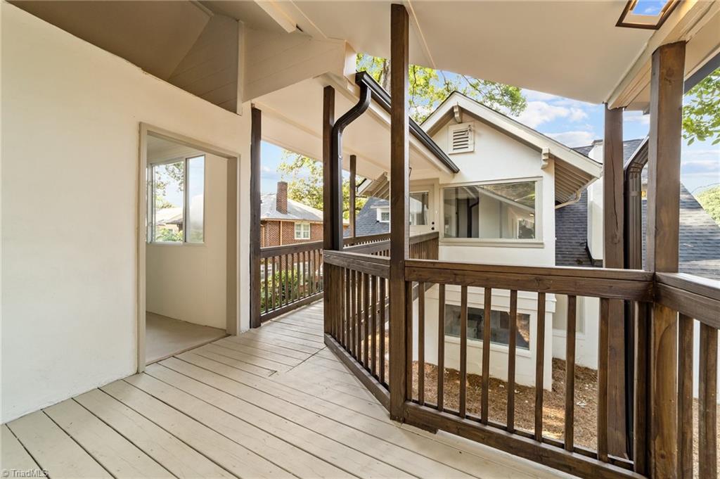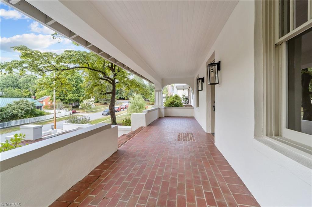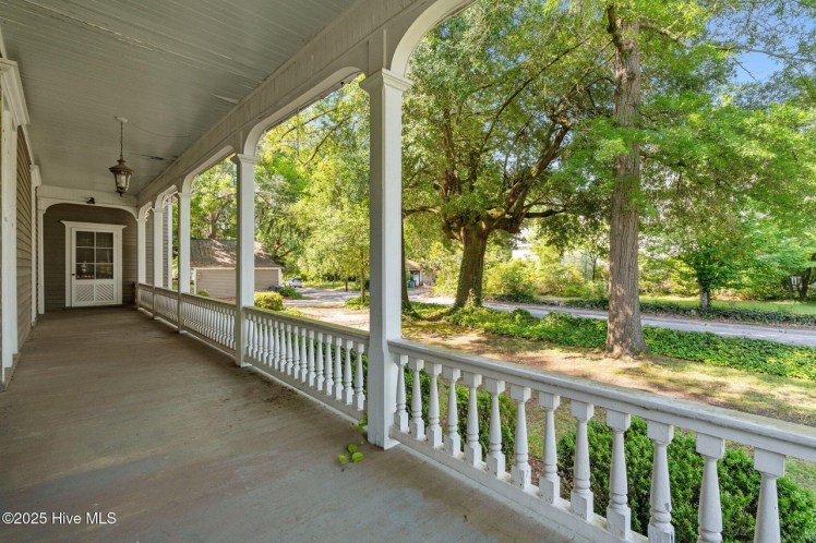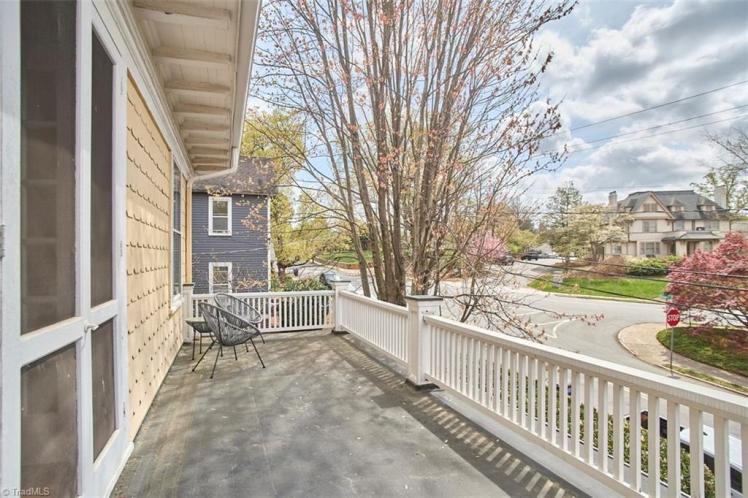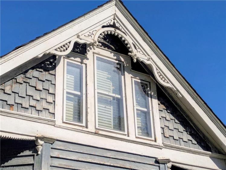 - “The porch stretches across the side wing with a projecting gabled entry hood on slender columns and lacy bracketing. The porch has been enclosed to create a sun porch, but retains its posts, flat sawn balustrade, and decorative bracketing.