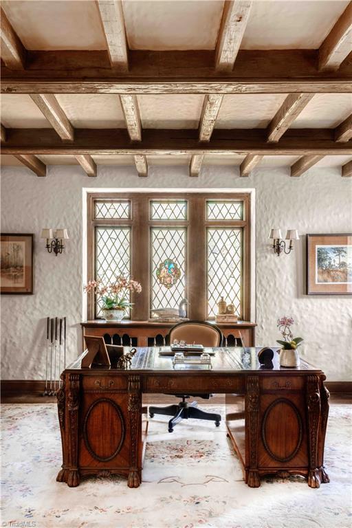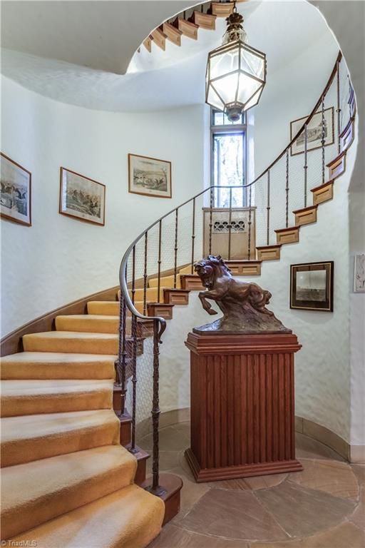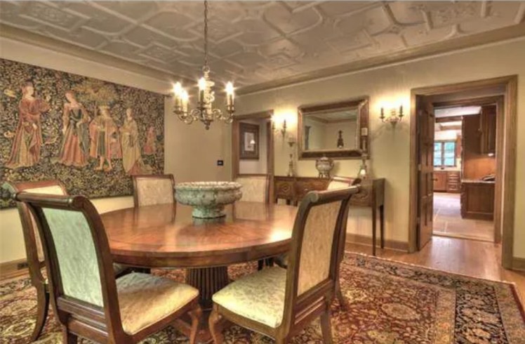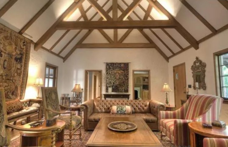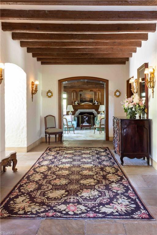 - The interior features butterfly pegged floors, wood and plaster moldings, leaded glass windows, solid wood beams, coffered ceilings and a marble wall fountain. A porte-cochere connects the house to its garages, two-bedroom guest quarters and herb garden.