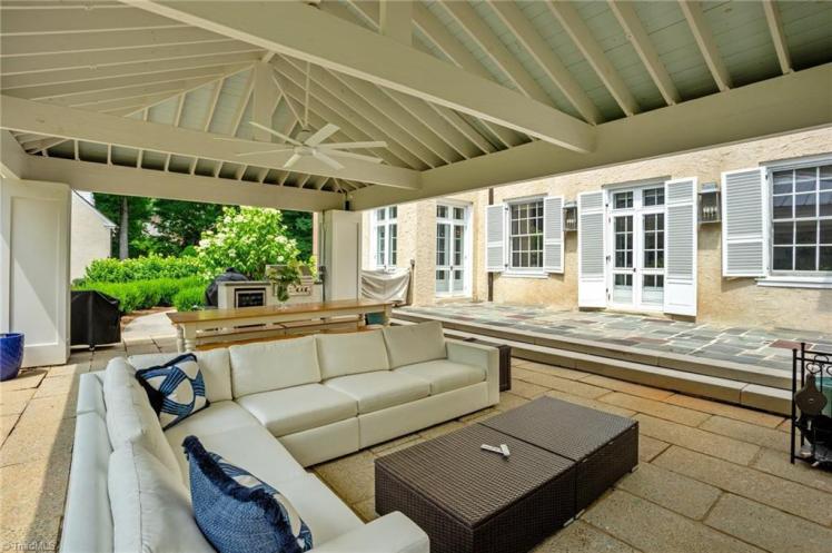 - The property includes a swimming pool, cabana, outdoor fireplace and “a ‘secret garden’ fountain bathed in wisteria.”