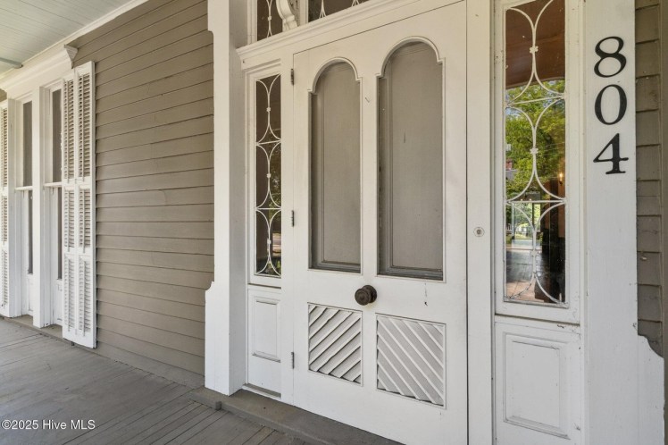 - “The porch is one step above sidewalk grade at the entry bay, located at the right end of the three bay façade, where a herringbone Dutch door abuts a six-over-six sash window. Two additional six-over-six sash windows are on the façade under the porch, where there is flush board sheathing; there are three windows on the second floor facade. Other elevations have six-over-six sash windows and all are hung with double panel shutters. Two six-light casements are in each upper gable end at the attic level. Doors and windows have molded casings.