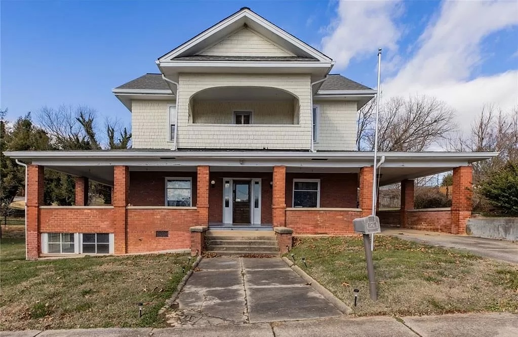 - District NR nomination: “The one-and-a-half-story, three-bay, cross-gabled, Craftsman house is brick on the first level and wood-shingled on the second and displays triangular knee braces.