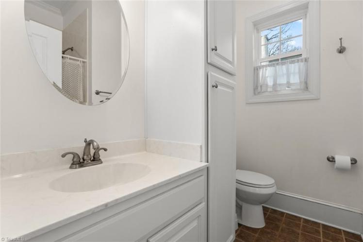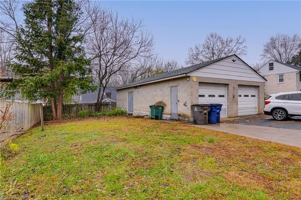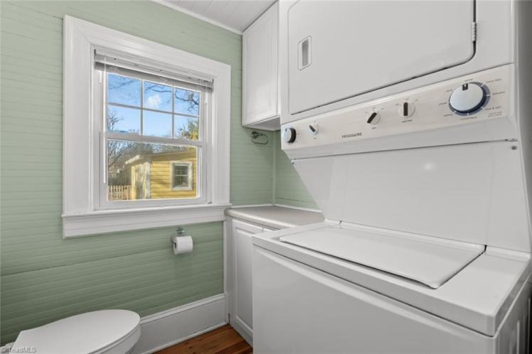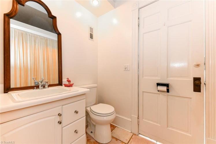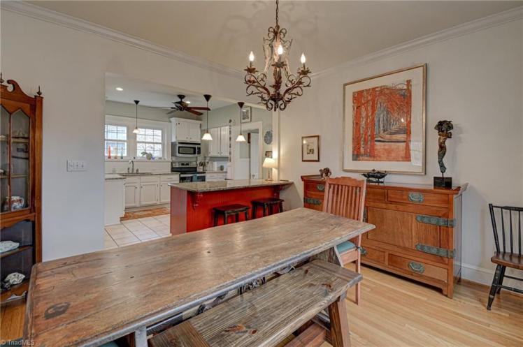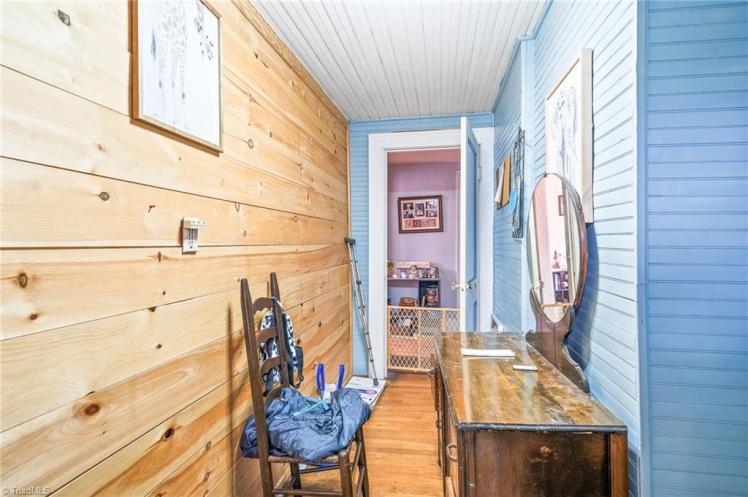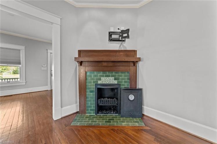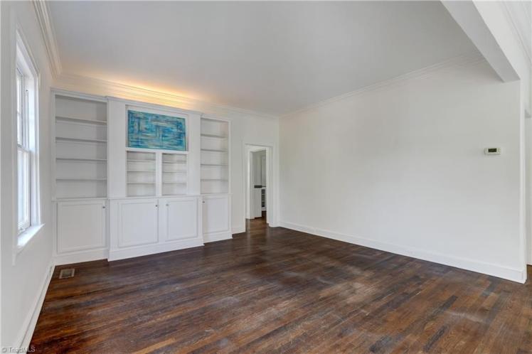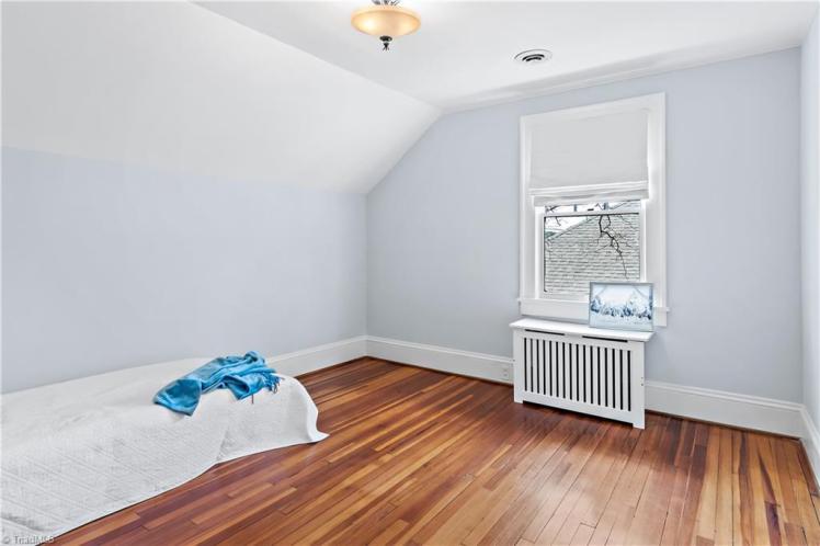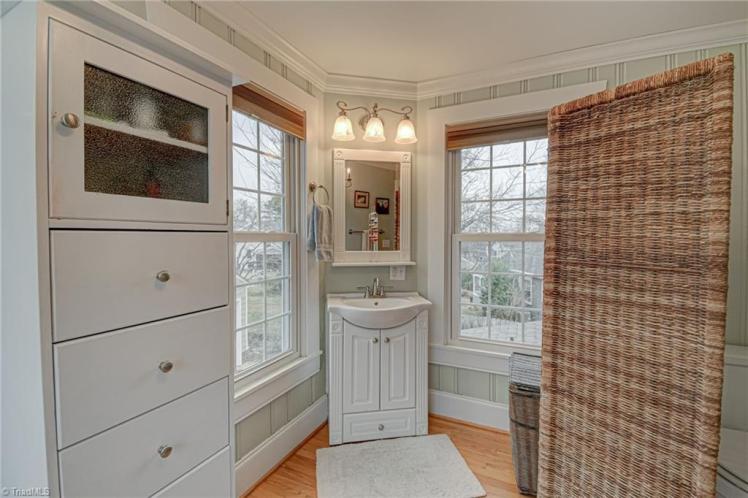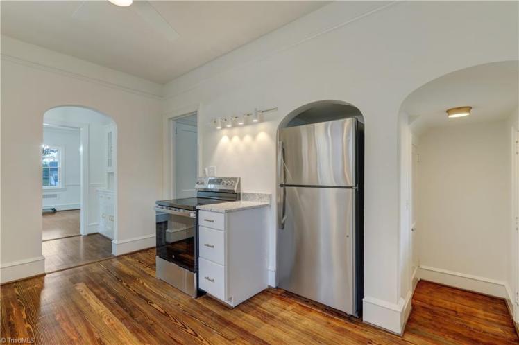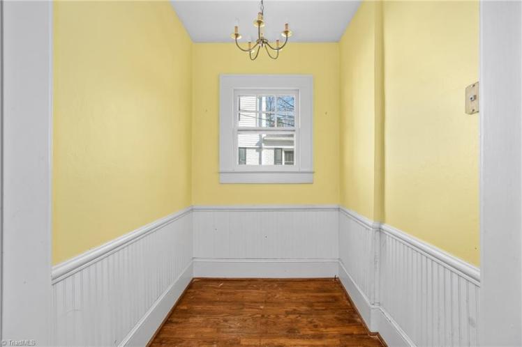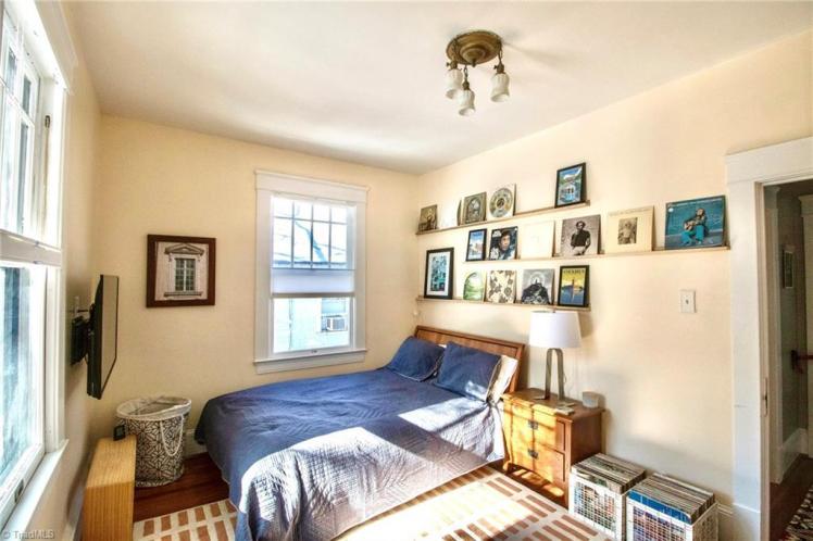 - District NR nomination: “Period Cottage. One and a half story; side gable; gable-roof dormers; asbestos shingle siding; six-over-six, double-hung sash and one-over-one replacement windows; front patio; small sidelights; steeply pitched, front-gable entry pavilion. 1938 CD: (1153) Thomas Wilson, an engineer at Piedmont Engraving.”