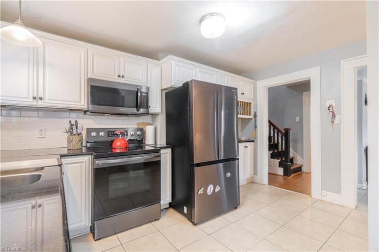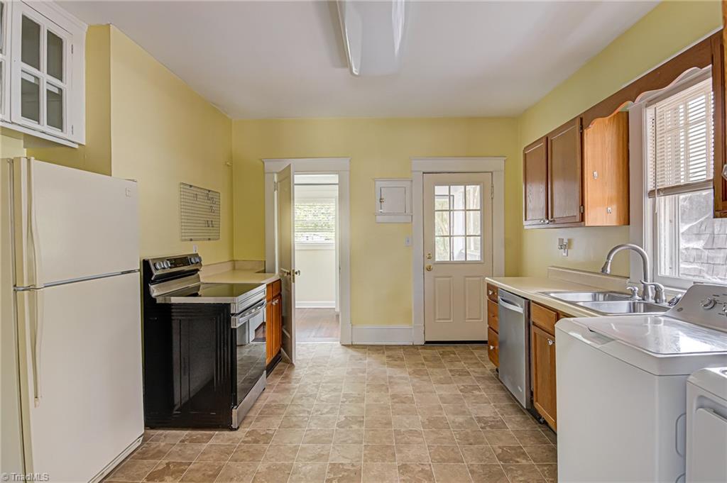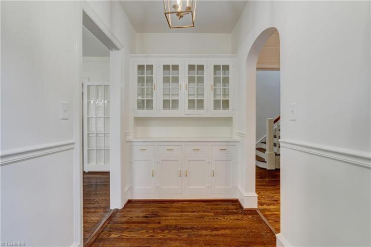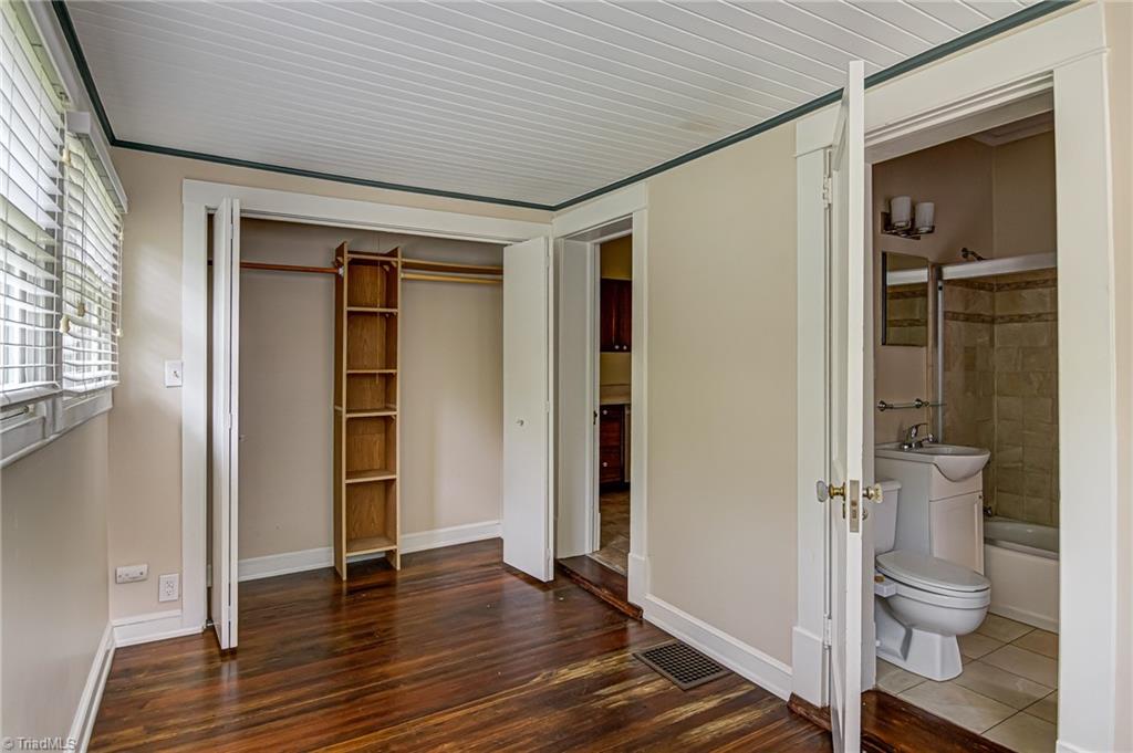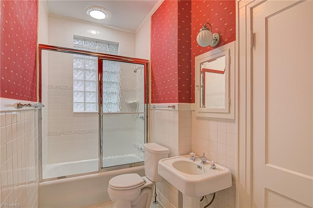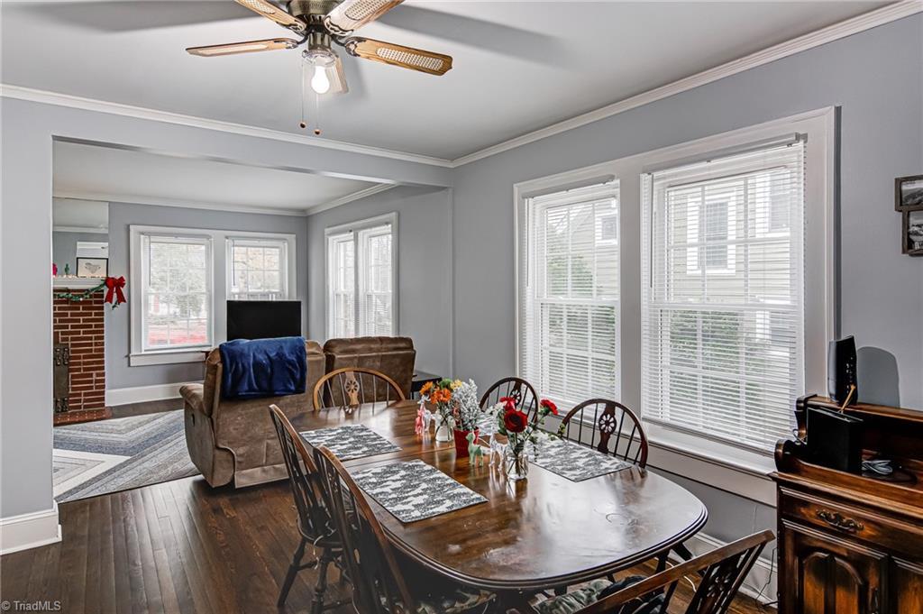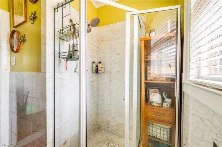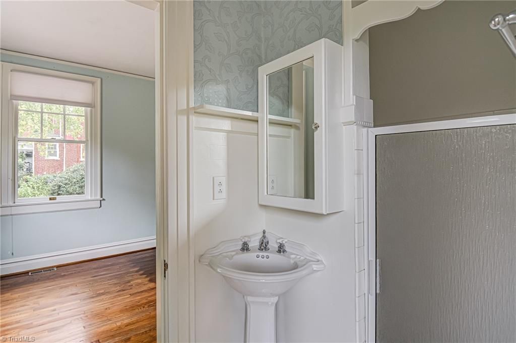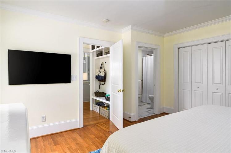 - District NR nomination: “Period Cottage. One and a half story; side gable; gable-roof dormers; asbestos shingle siding; six-over-six, double-hung sash and one-over-one replacement windows; front patio; small sidelights; steeply pitched, front-gable entry pavilion. 1938 CD: (1153) Thomas Wilson, an engineer at Piedmont Engraving.”