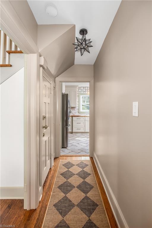 - District NR nomination: “Craftsman Bungalow. One story; front gable; engaged porch; paired, square posts; vinyl siding; shingled gable end; six-over-one, double-hung sash; false beams with thru-tenon detail; stone retaining wall and steps.”