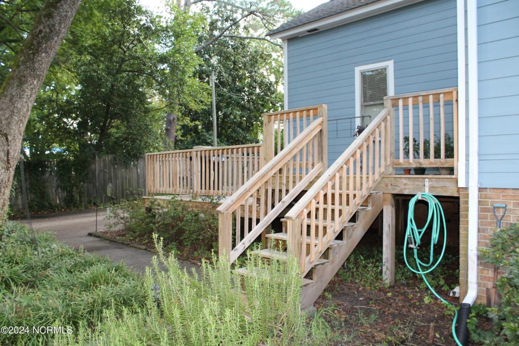 - District NRHP nomination: ““A long flight of steps leads up the steep hill from the street to the front entrance. The square house has weatherboard siding with beveled corners and a hipped roof with intersecting, wood-shingled, gabled dormers. The center-bay front entrance with sidelights is sheltered by a gable-roofed porch with grouped wood posts with lattice between the posts.