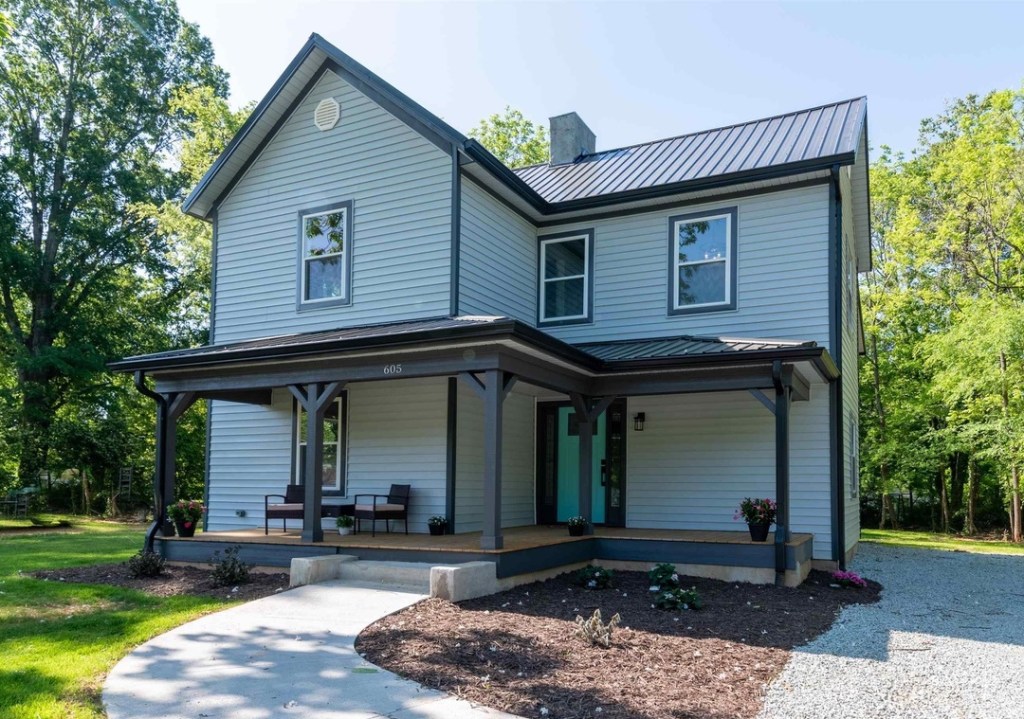 - “The two-story frame house is typical of Greensboro residences of the first decade of the twentieth century. Simply detailed, the Late Victorian form is characterized by a hipped roofline and a projecting hipped wing. This wing, with exterior access, might have served as an office. Decorative features are staid, including a deep cornice with boxed eaves, nine over nine windows, and a half-width front porch. Interior details curiously hint at an early construction date, such as capped door and window trim, a square stair newel post, and six-panel doors. The house is a special footnote for the neighborhood and represents the earliest history of Lindley Park.” — Preservation Greensboro