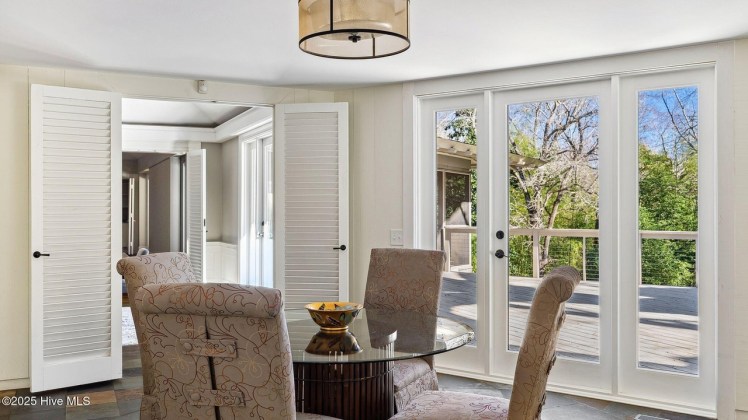 - “Two large old trees, a hickory and a post oak, were incorporated to enhance and provide shade, especially on the deck. A slope and view to the east are enjoyed from the porch and deck as well as Master Bedroom and glimpsed from Living Room, Dining Room and Recreation Room. Most of house is on one level, but because of slope to the east, part of the house, bedrooms, are on a basement level.”
