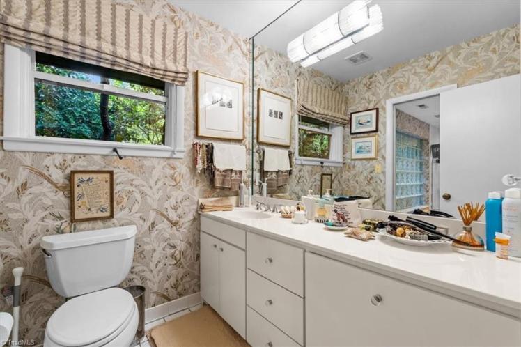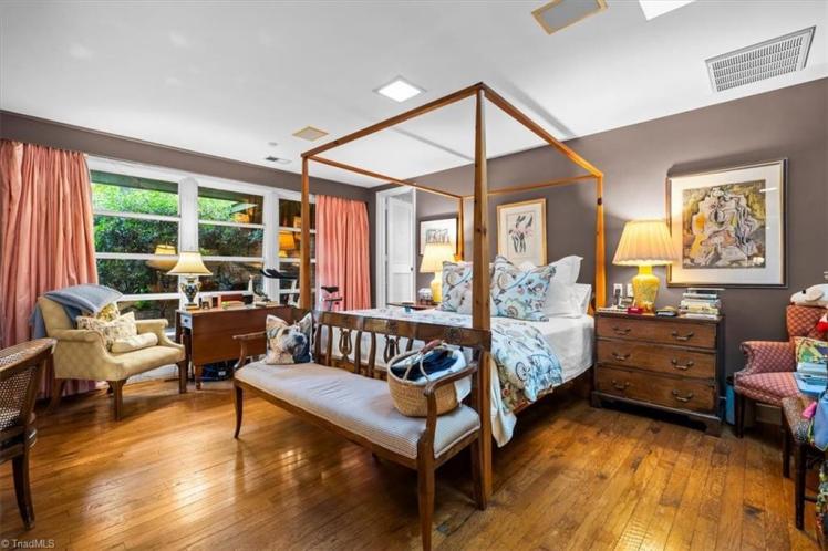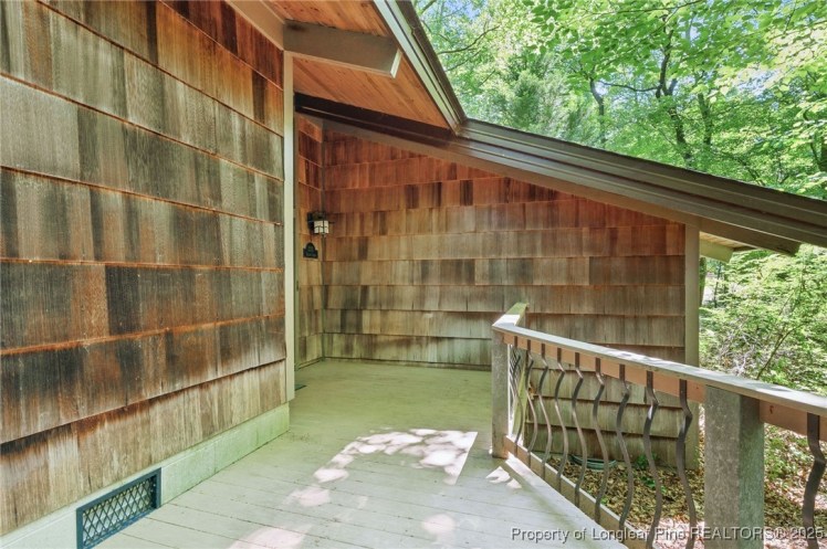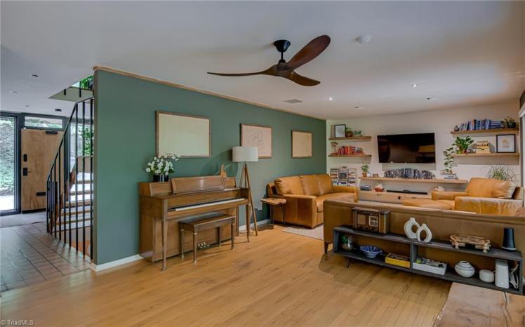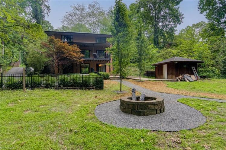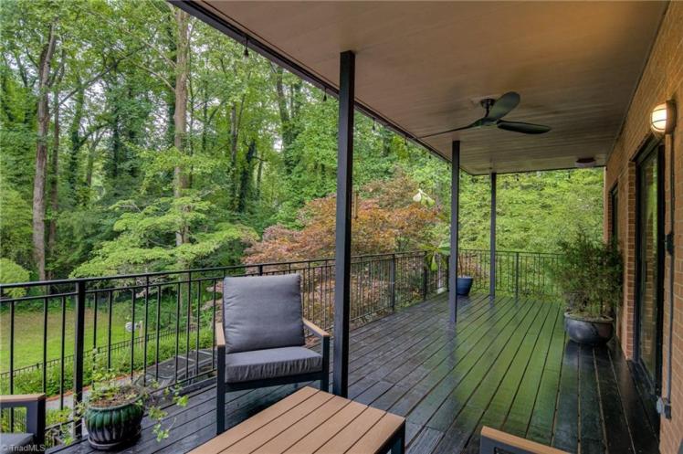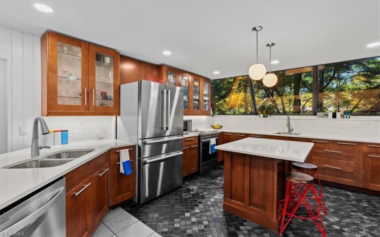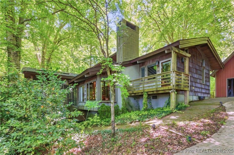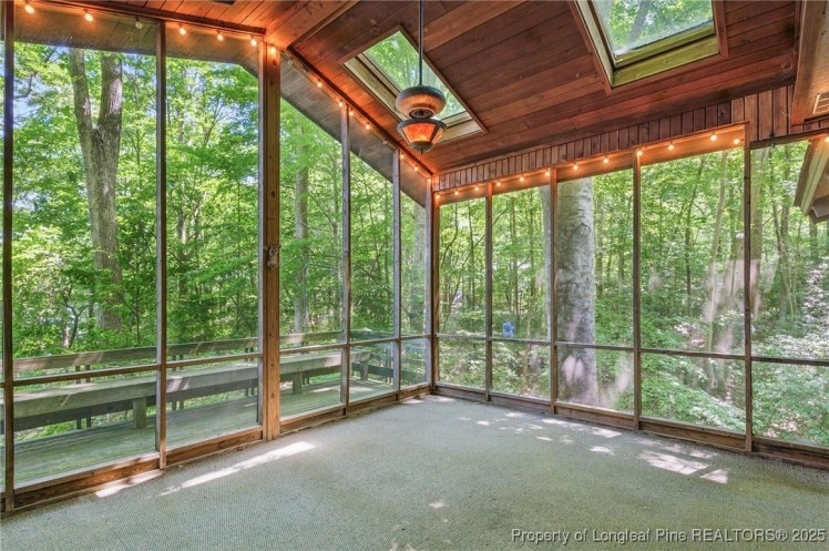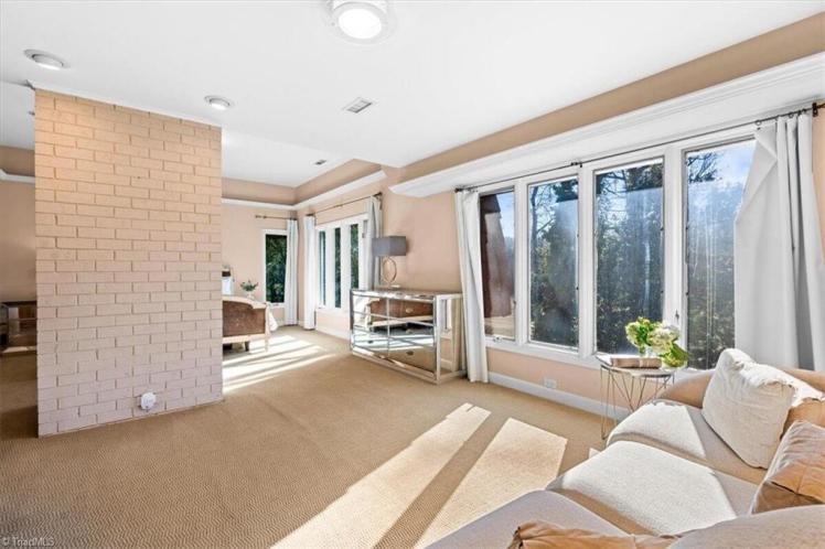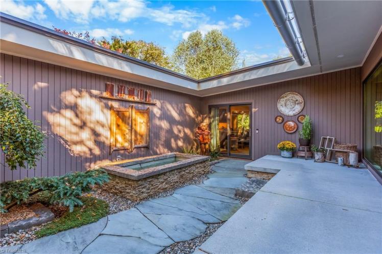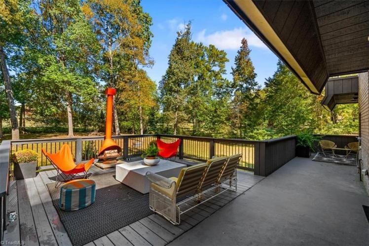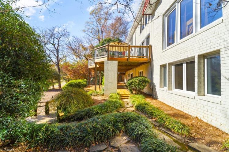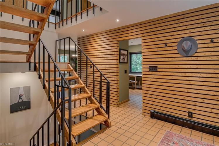 - The entrance hall has a 17-foot high wall of windows. There are large windows throughout the house, an open staircase and minimal ornamentation. At the back, a second-floor deck provides a view of the Sedgefield Country Club golf course. The house sits well back from the street in a forested landscape. The kitchen is modern but maintains its strikingly 1950s look.