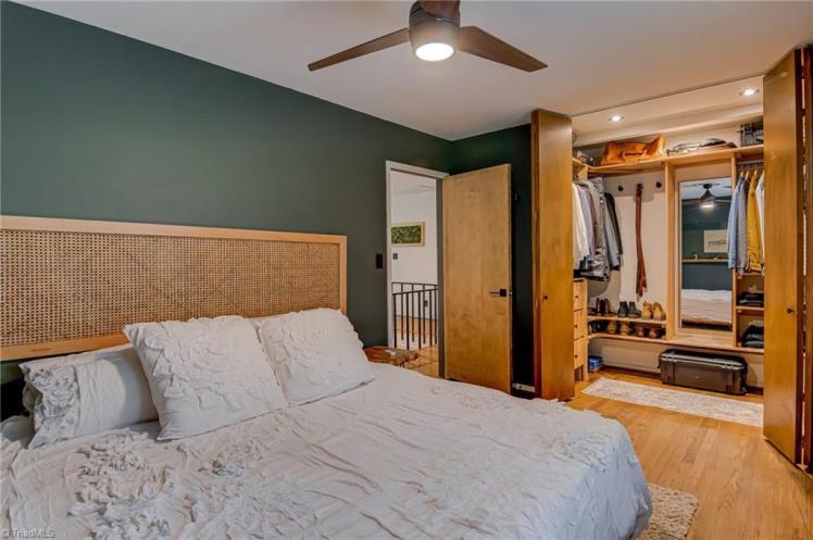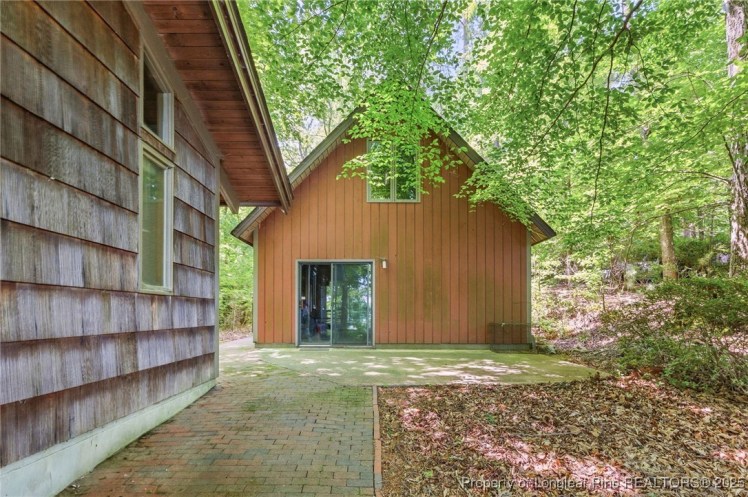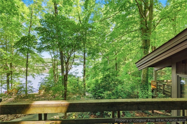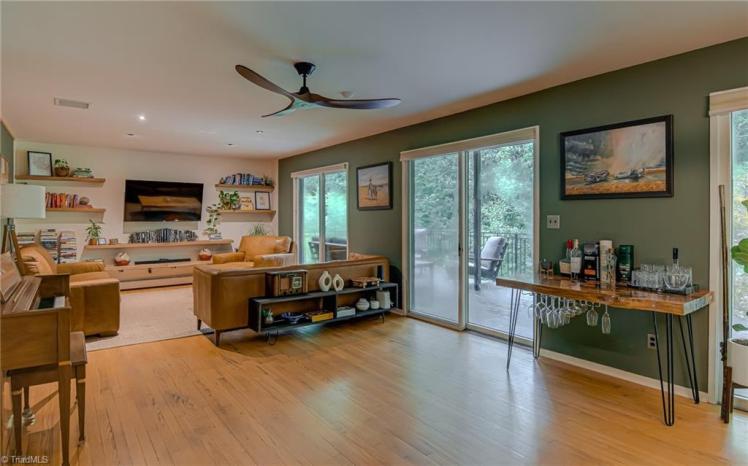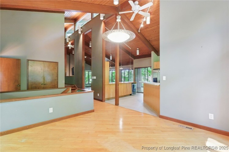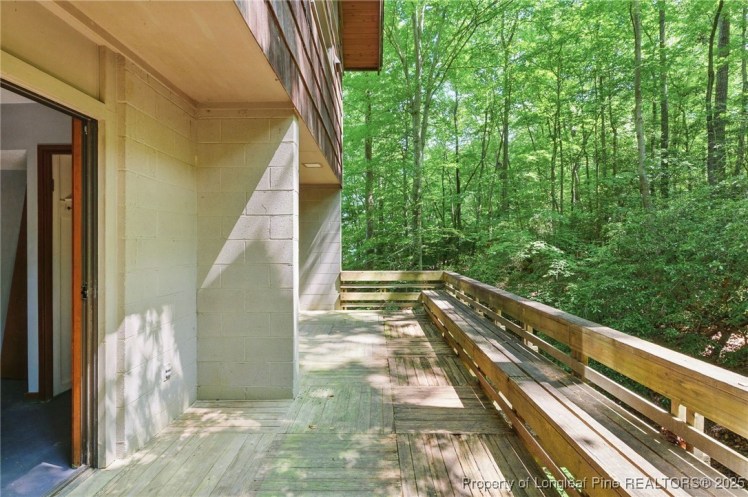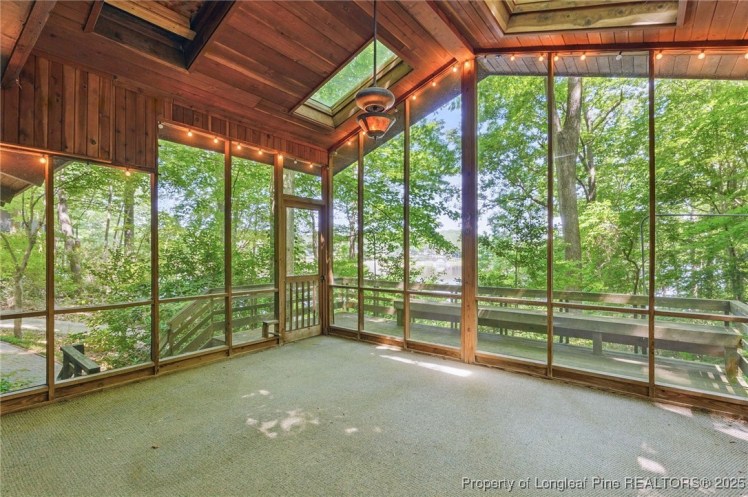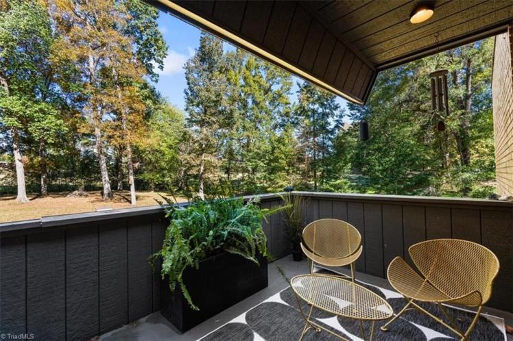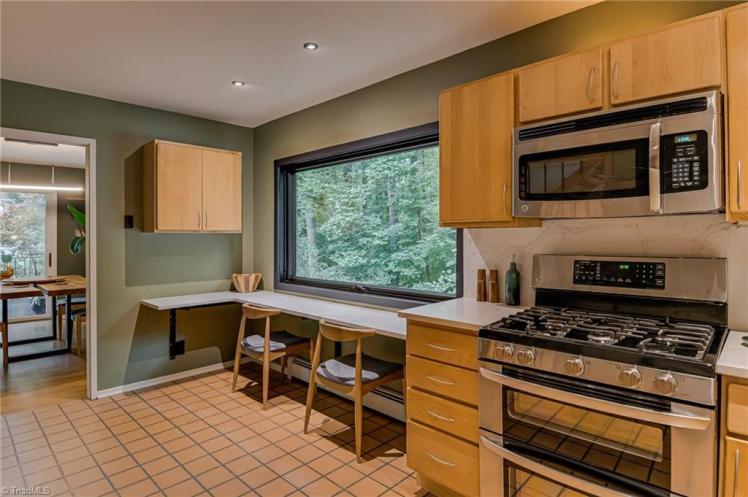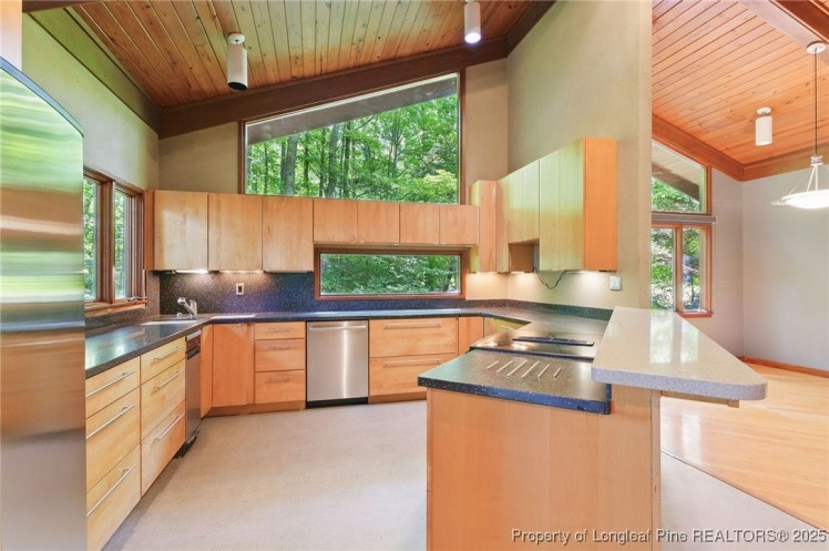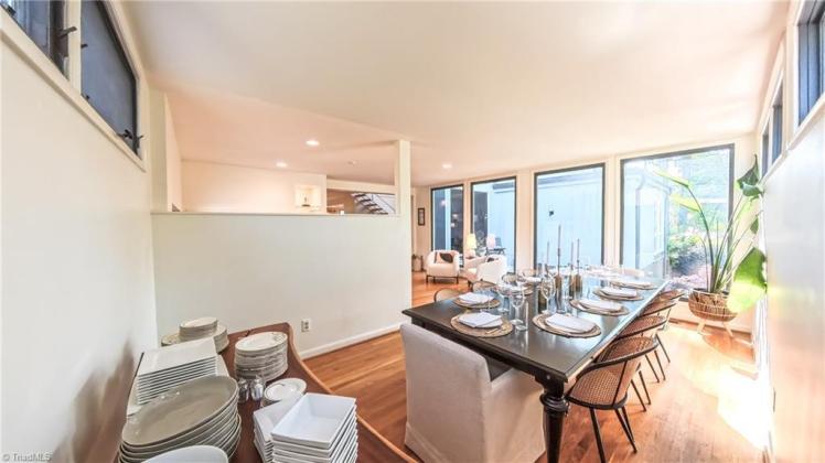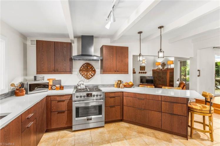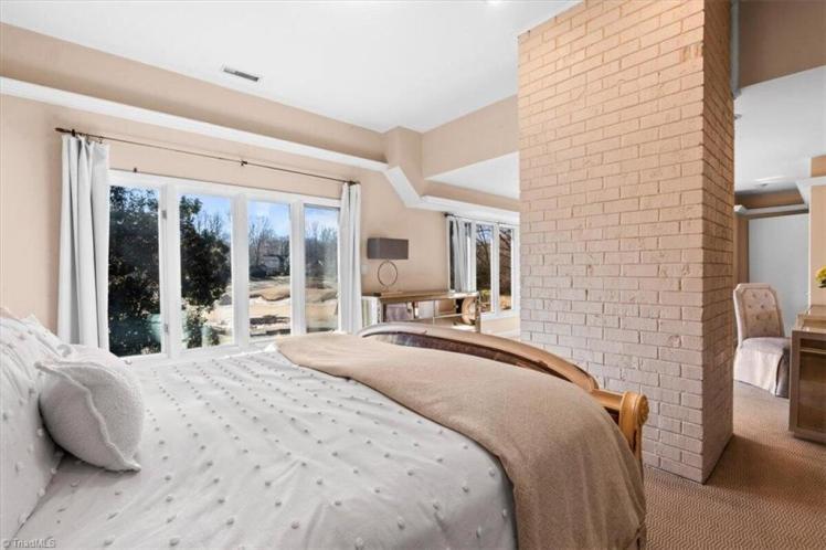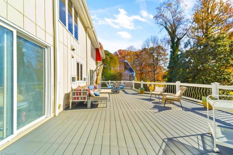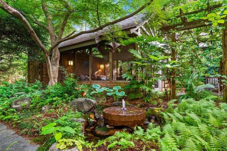 - The entrance hall has a 17-foot high wall of windows. There are large windows throughout the house, an open staircase and minimal ornamentation. At the back, a second-floor deck provides a view of the Sedgefield Country Club golf course. The house sits well back from the street in a forested landscape. The kitchen is modern but maintains its strikingly 1950s look.