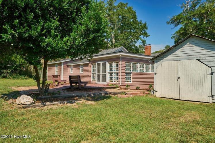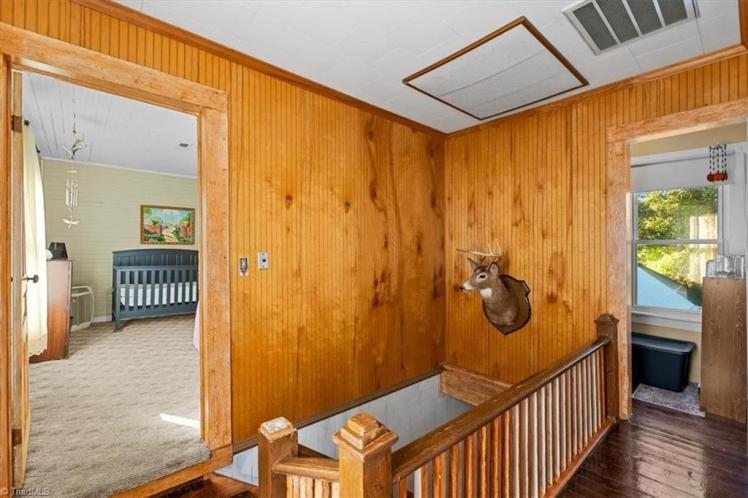 From the 2016 for-sale listing: “[T]his home was moved by the current family in the 60’s to take advantage of the pond view and modernized at that time.” The current listing calls the house “rich in history,” but much of the historic character has been lost to vinyl siding, replacement windows, sliding glass doors, etc. A National Register nomination for a similar house in Chatham County says of the Hackney house, “There is nothing to suggest the age of this house other than its style.”