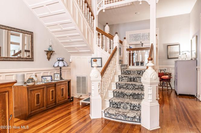 - “tall brick chimneys with paneled stacks; two-story rear ell with connector to one-story, hip-roofed wing; vinyl siding; broad central hall with spindle screen, ornate stair and vernacular Classical Revival mantel;