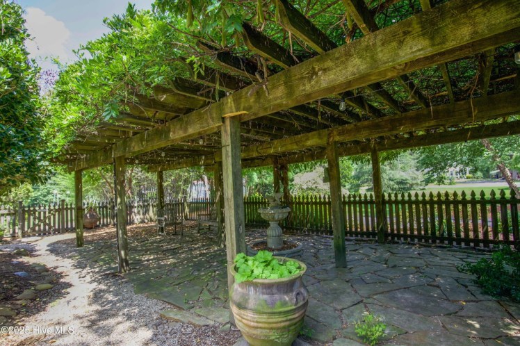 - “A later pergola shelters the patio with a solid balustrade and French doors on the front gable. Façade windows are one-over-one with weatherboard skirts below. They are topped with arched wood trim.