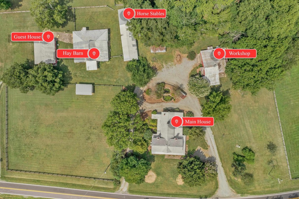 - The property includes a 1-bedroom, 1-bathroom guest house; a four-horse stable and tack room; three 1-acre paddocks; an 1,844 square-foot hay barn; a 3,030 square foot workshop; goldfish pond; apple, pear, cherry, pecan and fig trees; and chicken coops.