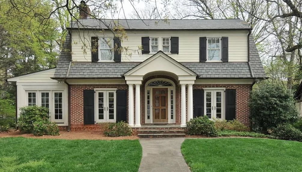 - “It has replacement windows and the replacement door is sheltered by a small, front-gabled porch on slender columns.