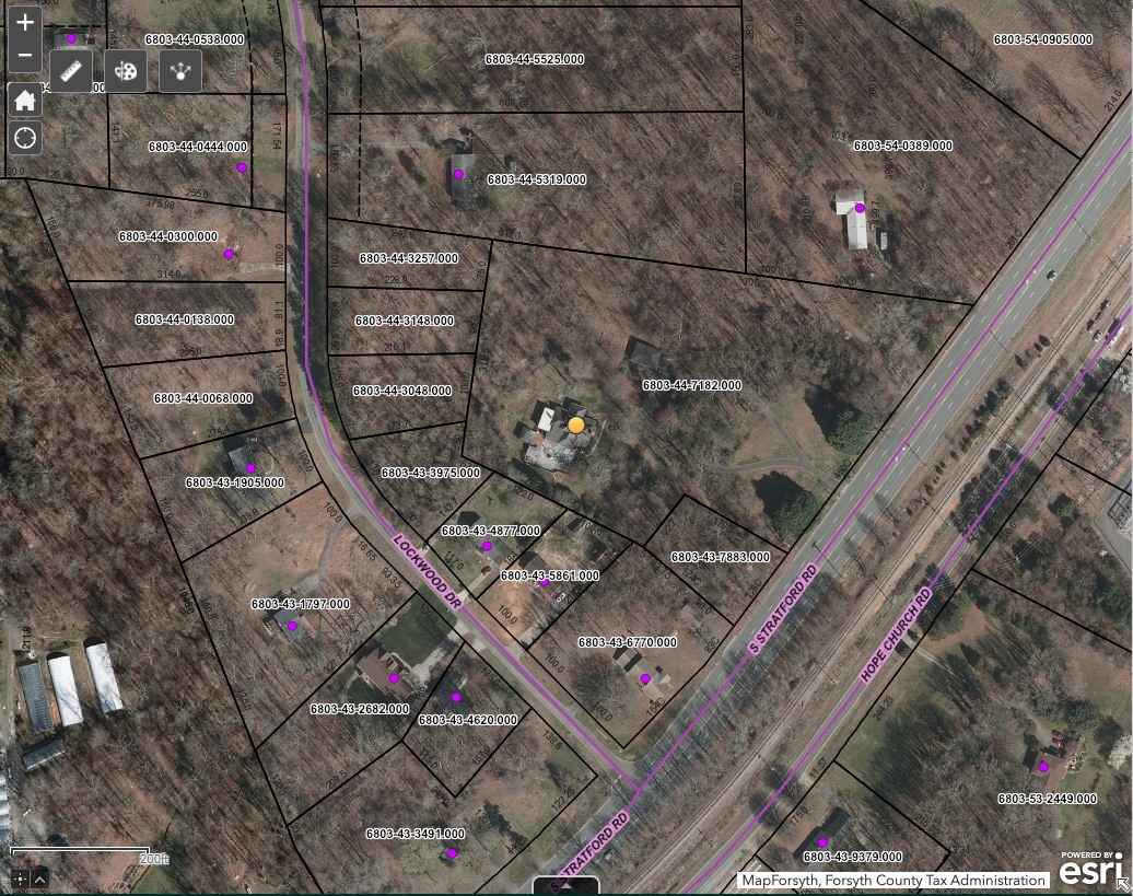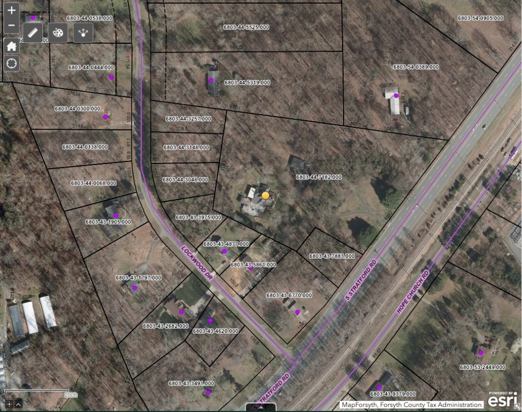 - On the GIS map below, the lots appear to be numbers 6803-44-7182 (the 5-acre lot), 6803-43-7883 on Stratford Road and around the corer on Lockwood Drive the adjacent wooded lots 6803-43-3975, 6803-44-3048, 6803-44-3148 and 6803-44-3257 (click on the map to see it larger).