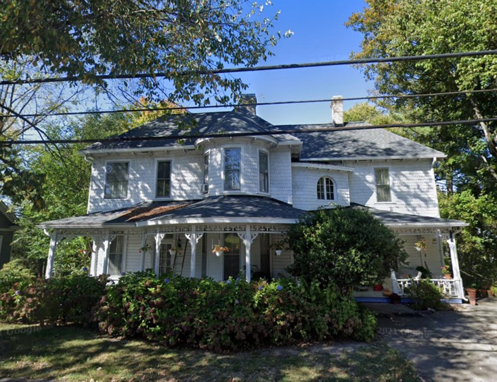 - District NRHP nomination: “Two-story Late Victorian tri-gable with asbestos shingle siding; central projecting bay, shingled gable end; hip-roof porch with chamfered posts, sawn brackets, and spindle frieze; two-over-two windows; single light, three-panel door. Appears on 1917 Sanborn Map.”