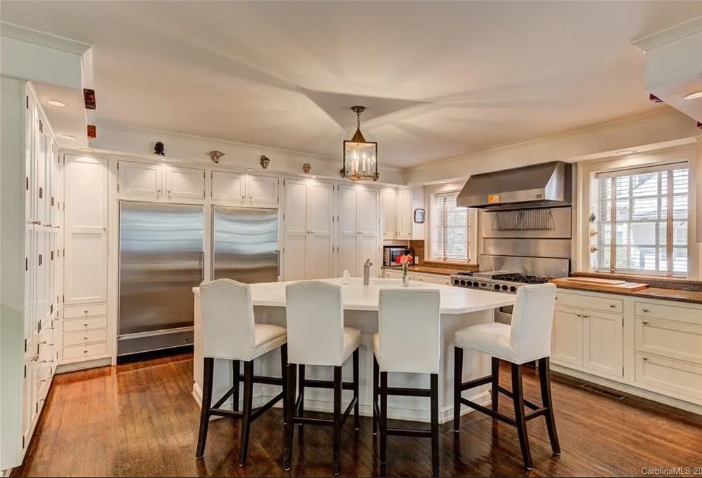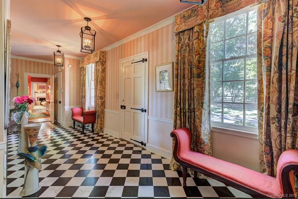 - Listing: “One of the largest and most famous homes in the Triad, this exceptional Tudor-style mansion completed in 1930 was designed by Winston-Salem architect Luther Lashmit (Graylyn Mansion) for textile magnate John Hampton “Hamp” Adams, co-founder of Adams-Millis Corporation. The construction materials, unsurpassed in style and workmanship, include a solid masonry foundation and walls, clay tile roof, custom paneling and woodwork, plaster moldings and custom ironwork. The attached garage/autocourt and detached stable are all executed in the same architectural style as the manor house. This is truly a one-of-a-kind opportunity!”