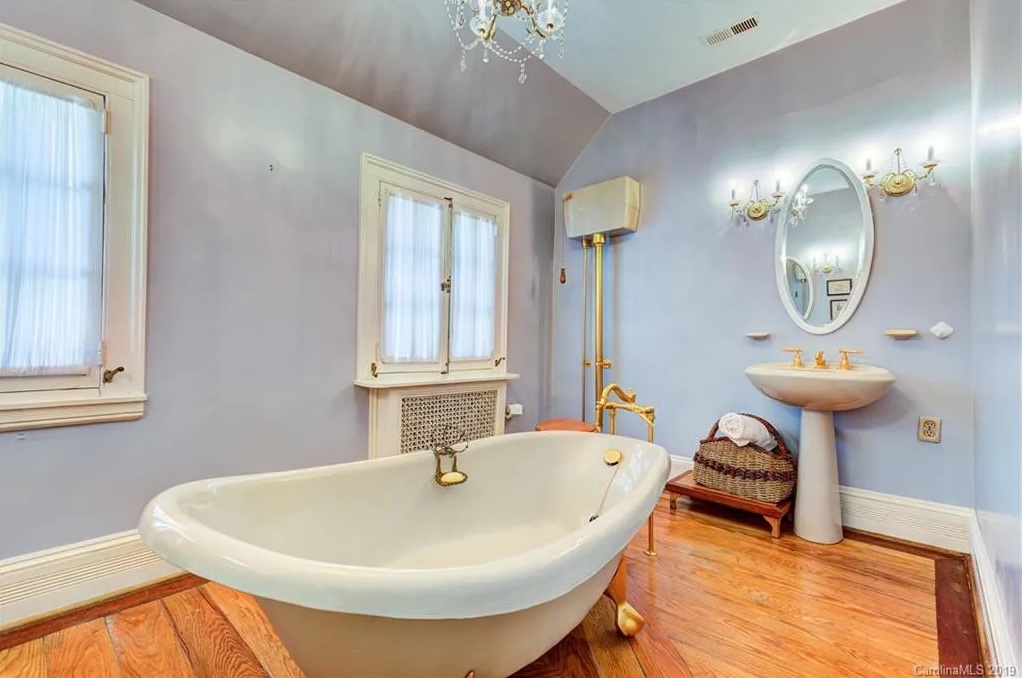 - Listing: “Many vintage details remain including light fixtures in downstairs bedrooms and hallway, shiplap siding and cabinet in kitchen, claw foot tub, and wainscoting in living/dining rooms.”
