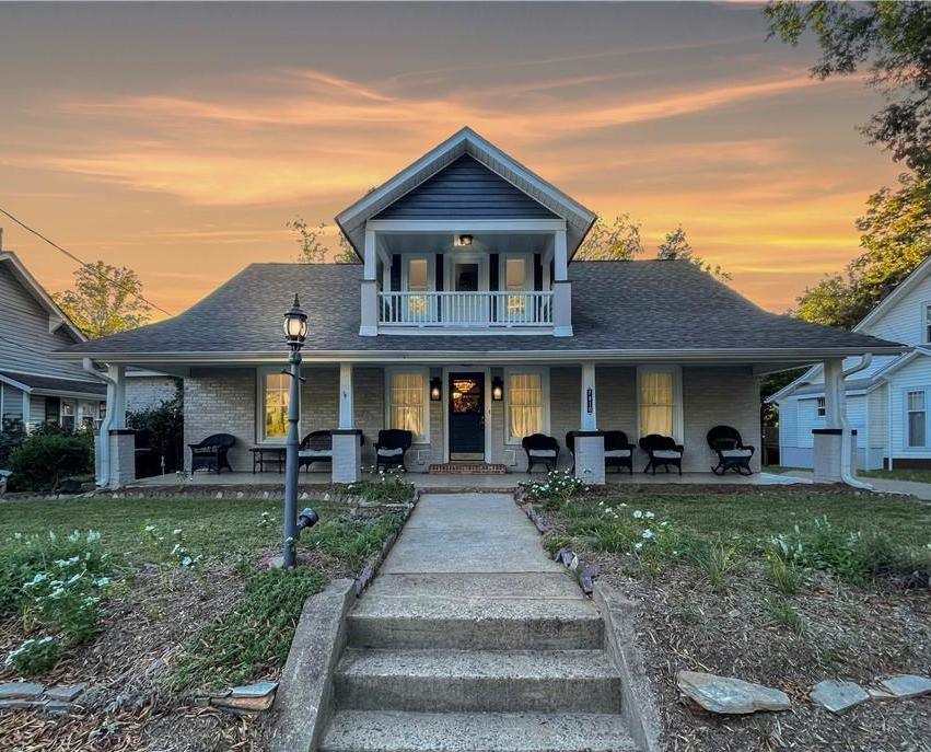 - “The one-light-over-two-panel door has replacement sidelights and is sheltered by a full-width, engaged porch supported by tapered wood posts on brick piers.