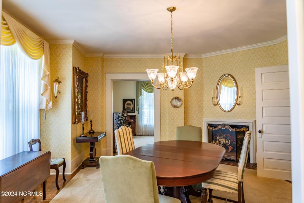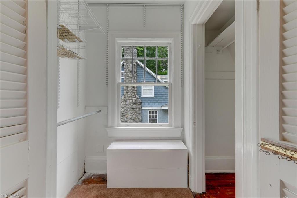 - District NR nomination: “Although moderately altered by the application of asbestos siding and the enclosure of a portion of the front porch, this early 20th century Colonial Revival frame house retains much of the original character which makes it a contributing element in the district. Its salient features include the three-bay facade with triple windows flanking the sidelighted entrance, the double-pile, central-hall plan, one-story porch supported by unfluted Ionic columns, and the low hip roof of standing seam tin with a central hipped dormer.”